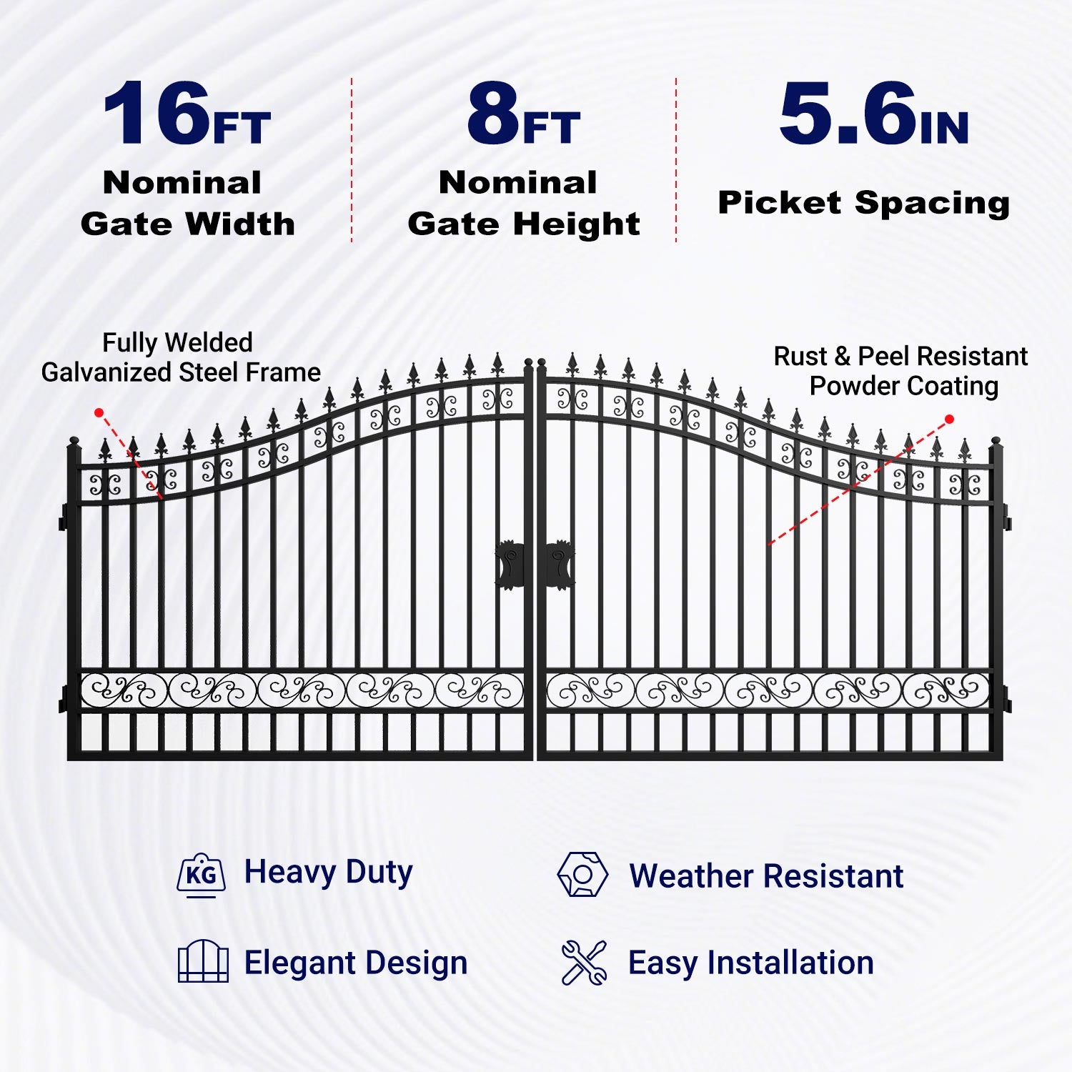 This 16-foot dual swing wrought iron gate offers a classic, timeless look with clean, unadorned lines. Built for durability and security, its sturdy iron construction provides an elegant entryway, while the lack of decorative elements offers a sleek, minimalist aesthetic.