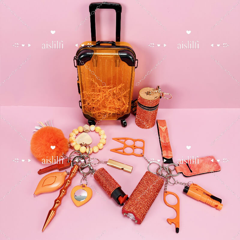 Sprayer, Kubaton, Cat Ears, Door Opener, Whistle, Key Cutter, Window Breaker, PomPom, Bluetooth Tracker, Alarm, Flashing Light, Lanyard, Lipstick Holder, Lipstick Bucket, Bead,mini suitcases