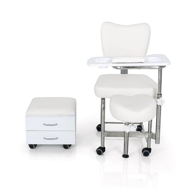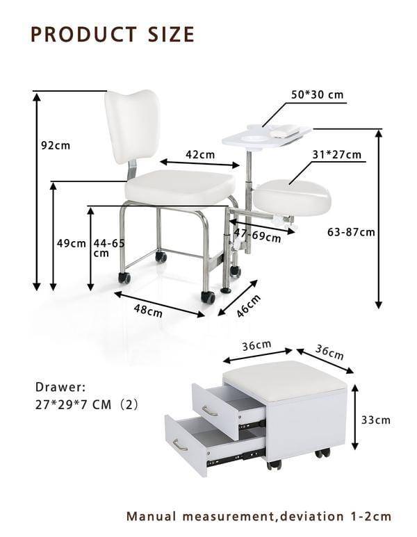 Do you have a home salon? A suite? Limited space or limited budget for your nail customers? No problem! The Compact Mobile Manicure Pedicure Chair Salon Station will be the choice for you! This portable Mani & Pedi 2 in 1 Nail Station is compact yet have spacious storage for you featuring with two spacious drawers under the seat. It also offers both seating for the client and the customer, and a service tray with two cup holders.