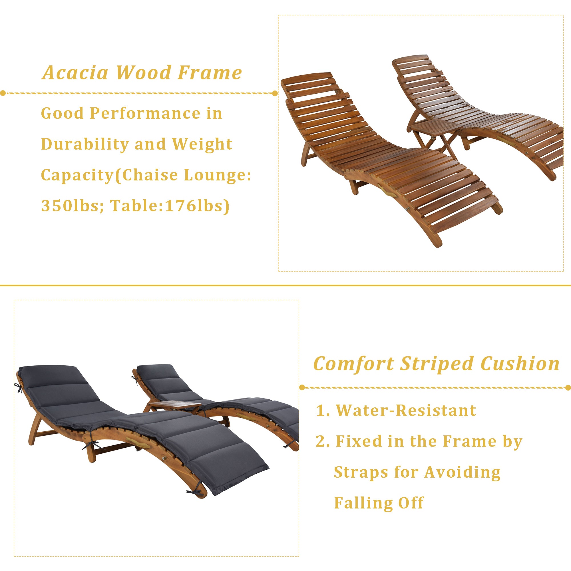 3 Pcs Outdoor Wood Chaise Lounge Set with Foldable Tea Table, Brown Finish & Dark Gray Cushion