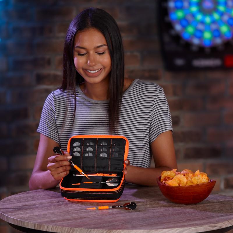The most comprehensive dart storage system in a portable package is here with the Casemaster Plazma Plus dart case with phone pocket! Made to stand up to the elements and protect your darts, the Plazma Plus combines both enduring strength of materials with easy-to-carry portability for a complete package. The Plazma Plus packs enough storage to suit even the most serious darters, including a large zippered pocket great for a mobile device as well as an additional zippered exterior pocket for easy accessibility when the case is closed. The prized possession of any darter is their darts, and the Plazma Plus can store 3 fully assembled darts! Each dart is secured in a form-fitting foam insert to prevent any movement that may cause damage. With plenty of space at either end of the case, you won’t have to fold down or crush your flights, and molded flights won’t bend, leading to longer lifespans and a truer flight path. In addition to dart and phone storage, this case can hold an armory’s worth of dart supplies to keep you on target and your darts in top form. To top it all off, the Plazma Plus dart case boasts eye-catching color highlights and low profile branding.