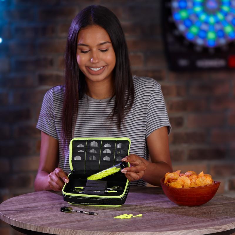 The most comprehensive dart storage system in a portable package is here with the Casemaster Plazma Plus dart case with phone pocket! Made to stand up to the elements and protect your darts, the Plazma Plus combines both enduring strength of materials with easy-to-carry portability for a complete package. The Plazma Plus packs enough storage to suit even the most serious darters, including a large zippered pocket great for a mobile device as well as an additional zippered exterior pocket for easy accessibility when the case is closed. The prized possession of any darter is their darts, and the Plazma Plus can store 3 fully assembled darts! Each dart is secured in a form-fitting foam insert to prevent any movement that may cause damage. With plenty of space at either end of the case, you won’t have to fold down or crush your flights, and molded flights won’t bend, leading to longer lifespans and a truer flight path. In addition to dart and phone storage, this case can hold an armory’s worth of dart supplies to keep you on target and your darts in top form. To top it all off, the Plazma Plus dart case boasts eye-catching color highlights and low profile branding.