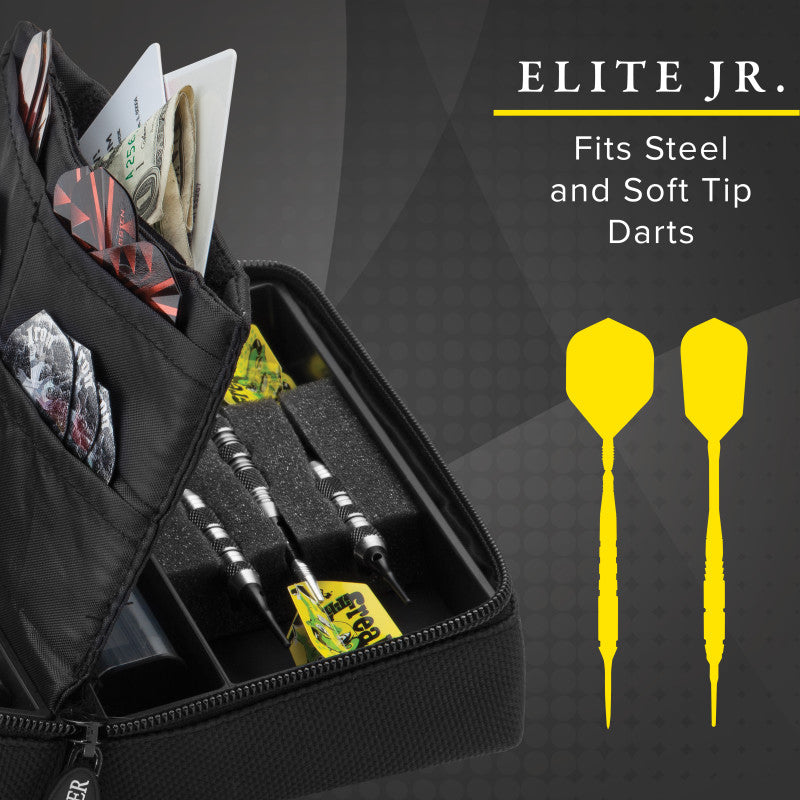 The most comprehensive dart storage system in a portable package is here with the Casemaster Elite Jr. Six Dart Nylon Dart Case! Constructed from tenacious nylon fibers woven around a hard resin shell, the Elite Jr. combines both enduring strength of materials with easy-to-carry portability for a complete package. The Elite Jr. packs enough storage to suit the most serious darters. The prized possession of any darter is their darts, and the Elite Jr. can store six of them, two complete sets! Whether you’re carrying an extra set to lend out or you’ve got to have just the right dart for the situation, we’ve got you covered. Each dart is locked into place with a solid foam inserts to prevent the darts from moving, which could cause breakage. With plenty of space at either end of the case, you won’t have to fold down your flights, leading to longer lifespans and a truer flight path. Both steel tip darts and soft tip darts will fit nicely into this stylish case. In addition to dart storage, the Elite Jr. can hold an armory’s worth of dart supplies to keep you on target and your darts in top form. With six pockets for extra flights and shafts, you’ll never be without replacements. The pieces that truly set the Casemaster Elite Jr. apart are the plastic accessory storage tubes, with separate lids, to sort out your spare tips and any other smaller accessories you need to bring out to darting events. Finally, the Elite Jr. is truly an all in one solution with its larger accessory pocket for things like membership cards, IDs, or cash. This great looking durable case is backed by GLD Products’ 90 day guarantee, should something go wrong.