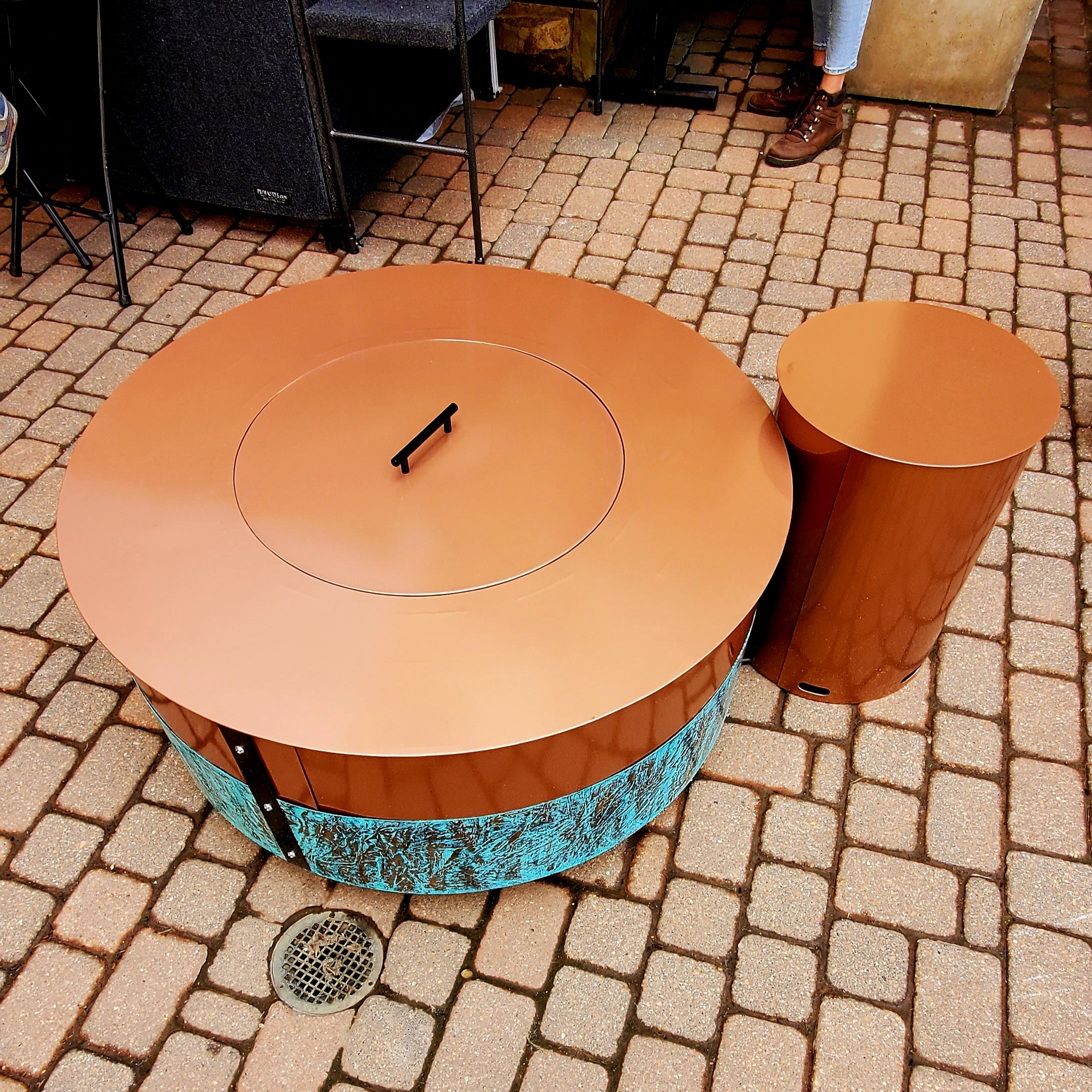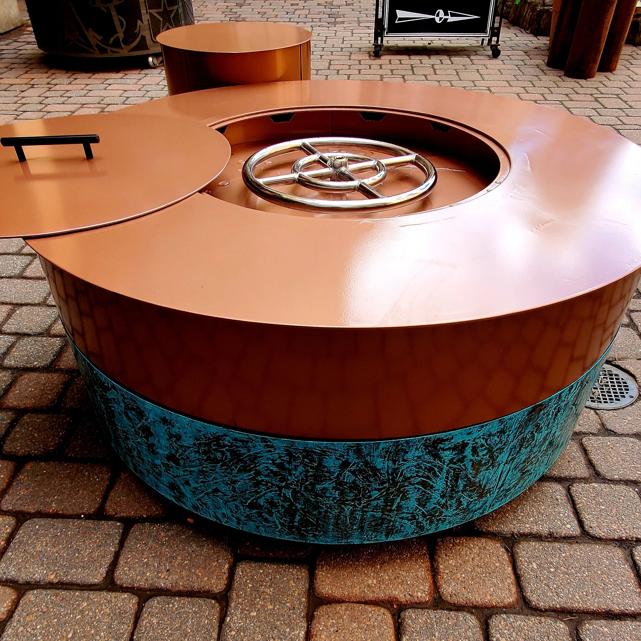 This stunning 36" fire pit is crafted from Copper River and accented with a wide band of hand-patinated copper in rich turquoise tones. The Caldera is a supersized statement piece, designed to elevate any backyard with its striking blend of natural texture and artistic finish.