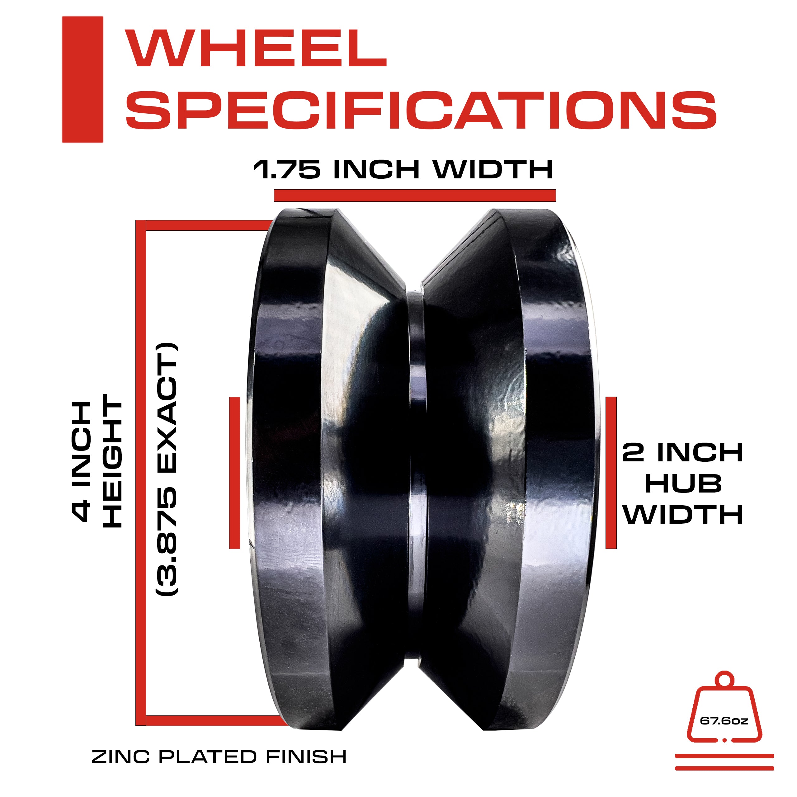 Specifications: V Grooved Wheel 4” x 4” x 1.75” (98.3 x 98.3 x 45.5mm), Heavy Duty 3000 LB Load Capacity. ½” (12.1mm) Bore Diameter, 2” (50.8mm) Hub Length