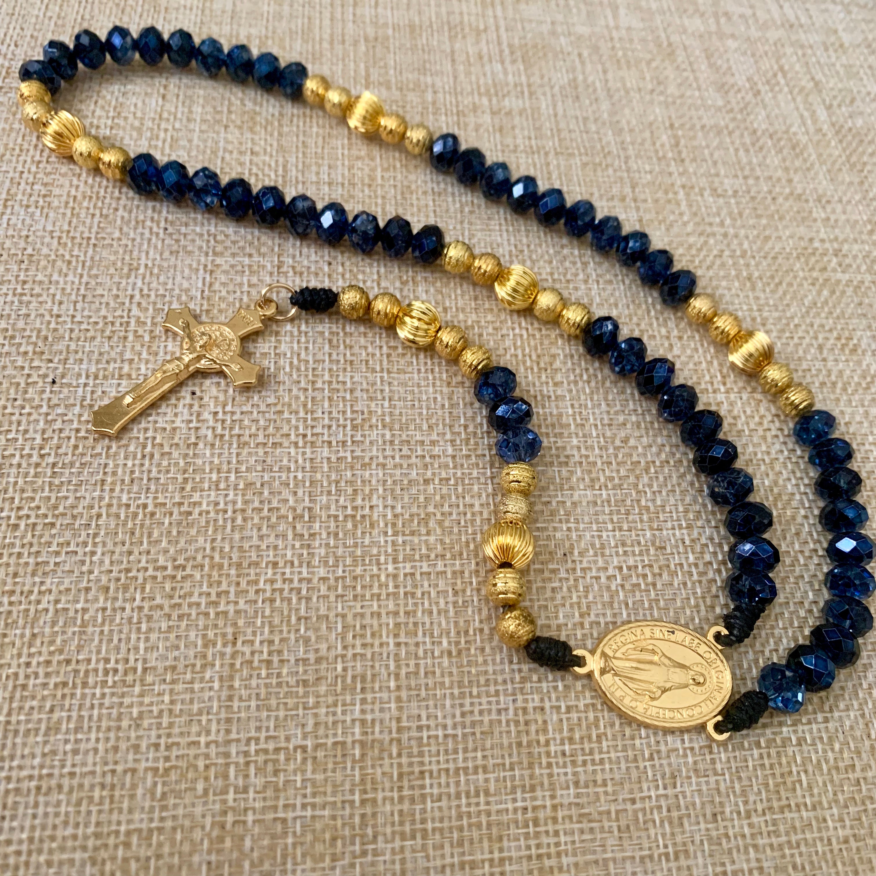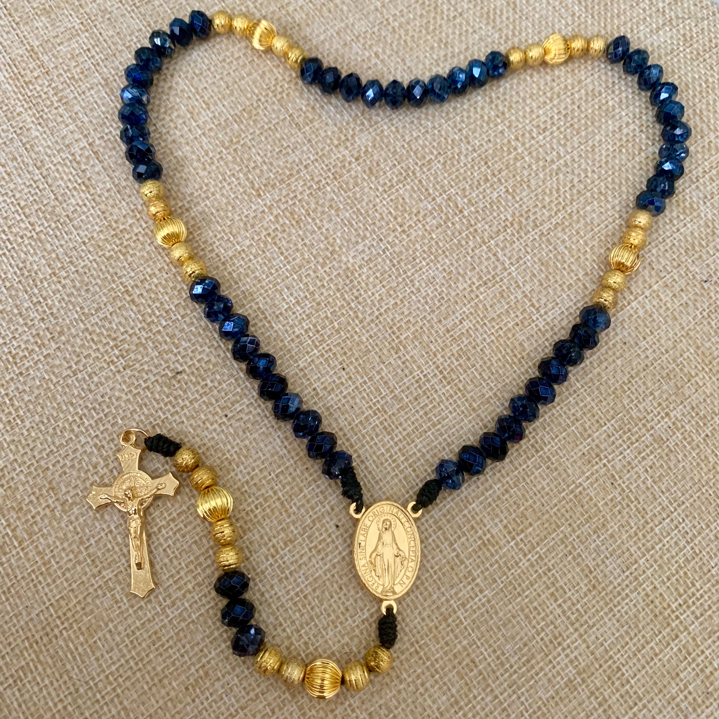 This covenant rosary is made with dark iridescent navy blue rondelle glass beads with beautiful gold Our Father beads. It begins with a gold finish Saint Benedict Crucifix imported from Italy.