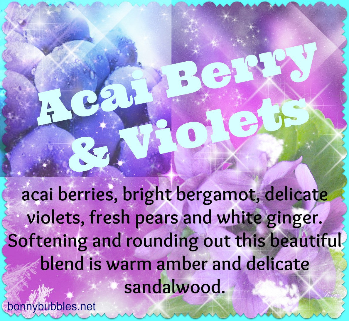 ACAI BERRY and VIOLETS deodorant body powder... acai berries, bright bergamot, delicate violets, fresh pears and white ginger. 8 oz vol. / 5 oz. net wt.