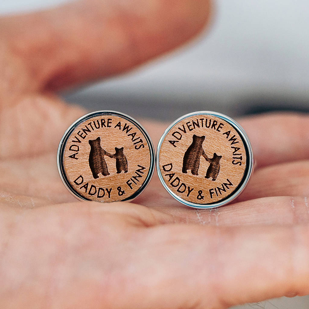 Silver plated with beautiful engraved cherry wood, these personalised wooden cufflinks make a perfect gift for Dad off their favourite little bear cub.