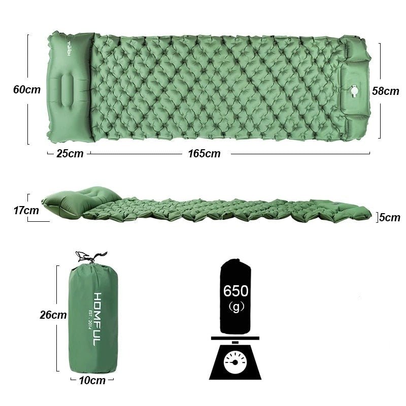 - Lightweight and portable inflatable camping mattress with a built-in pillow.