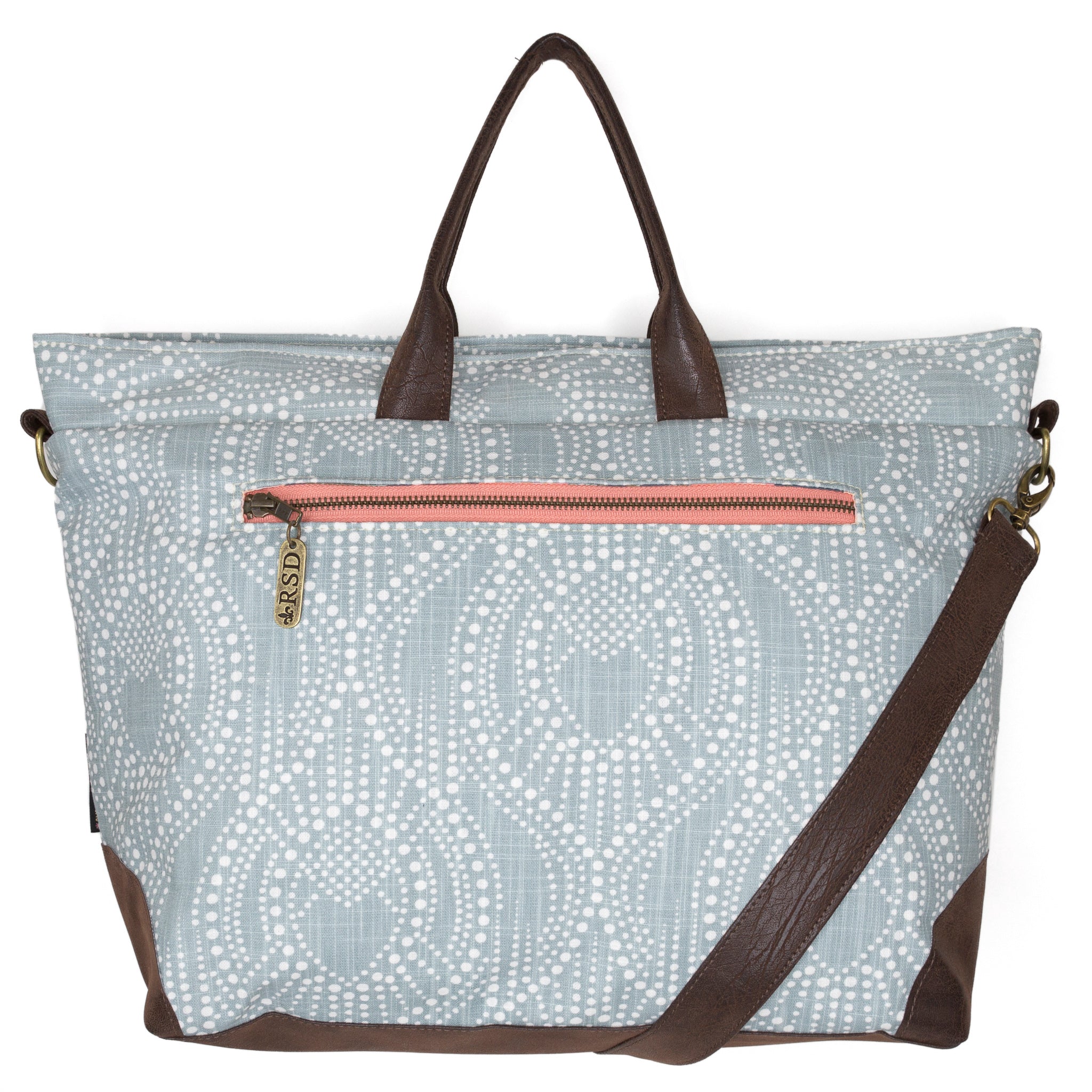 - faux leather base, briefcase handles, adjustable crossbody strap, and optional crossbody strap pad