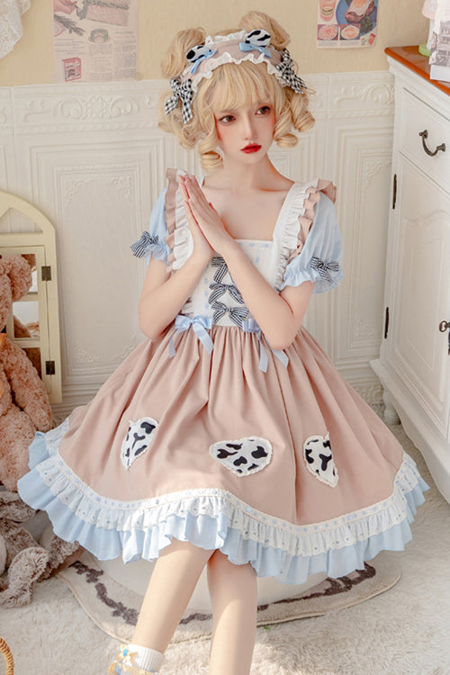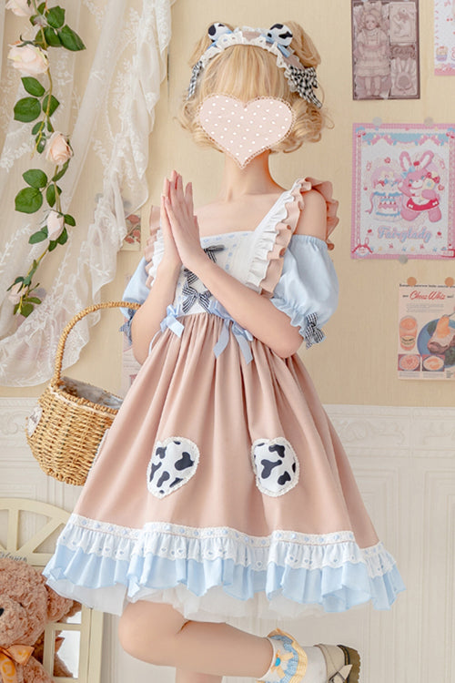 Apricot Pastoral Girl Ruffled Sling Short Sleeves High Waisted Sweet Lolita OP Dress