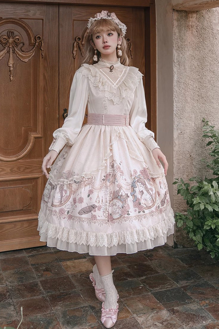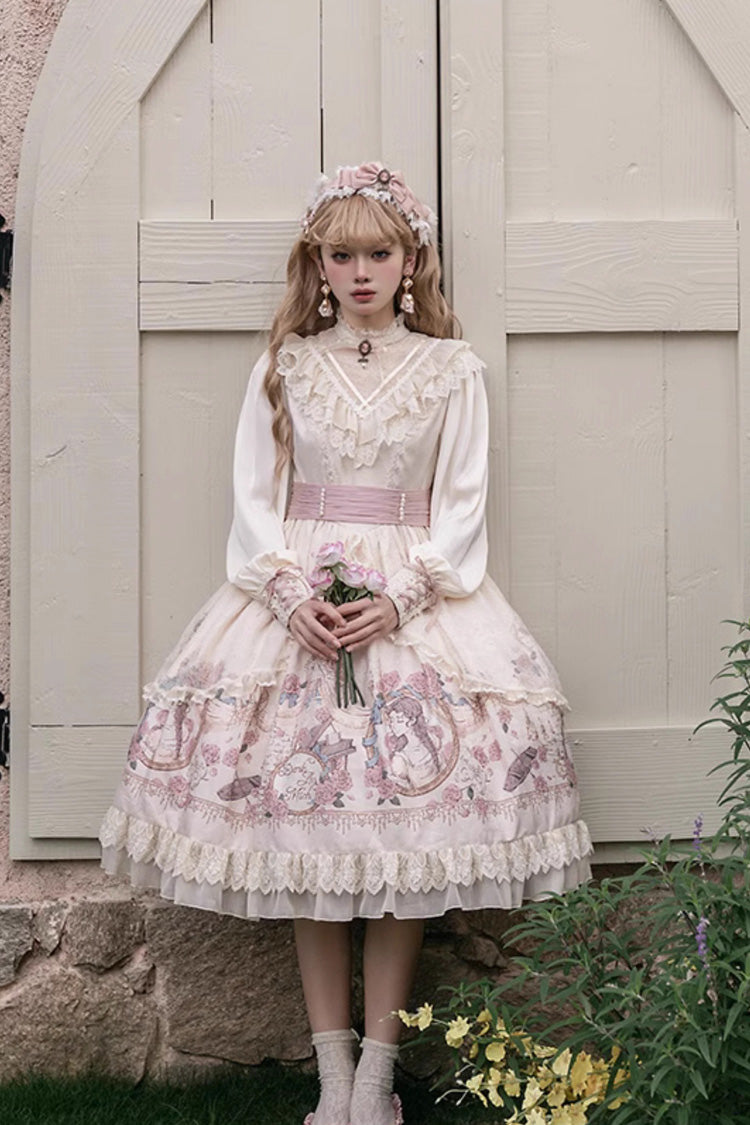 Apricot Rose Prologue Print Long Sleeves Ruffle Sweet Elegant Lolita Dress