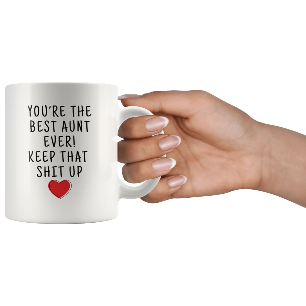 This coffee mug features a funny aunt saying "You're The Best Aunt Ever! Keep That Shit Up" and a heart graphic. This mug is perfect as a Christmas or birthday gift for your favorite aunt.