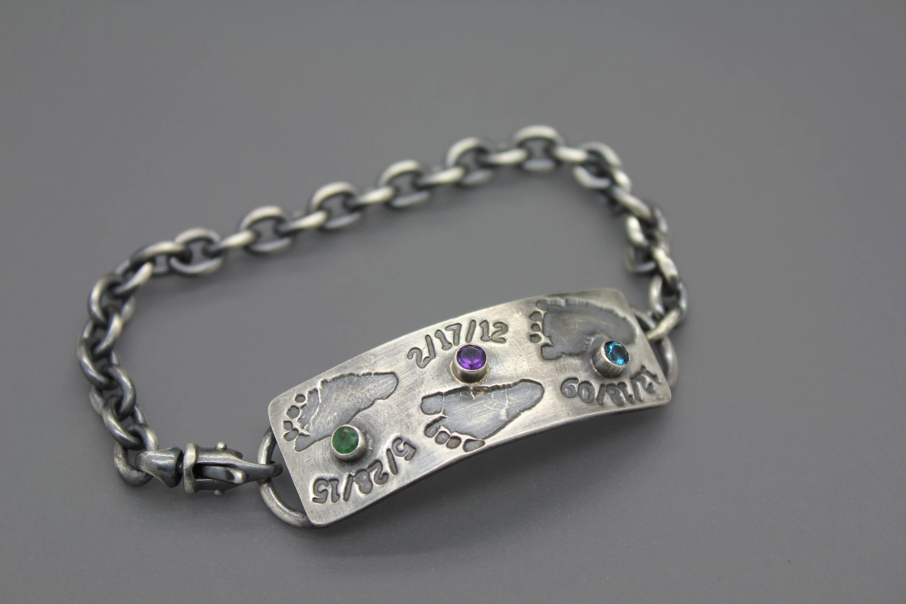 This sterling silver bracelet is made from your children's actual footprints, and proudly displays their birth dates and birthstones as well. As shown, the bracelet measures approximately .60" tall and 1.64" across. These measurements may change with the amount of prints you provide. This listing includes up to four feet with dates and simulated stones. If you need more than four prints, please inbox me. The sterling silver chain is a sturdy 4.5mm thick cable chain that is soldered on one side of the bracelet, and connects by swivel lobster clasp on the opposite side. Footprints and birthdays can be sent to me via email at [email protected]. Your exact footprints are shrunk to size and transferred onto sterling silver, which is then kiln fired. Pendant and bracelet are given antiqued/brushed finish. From the drop down, please select the length you would like the FULL bracelet to be from one end to the other in inches.Ê