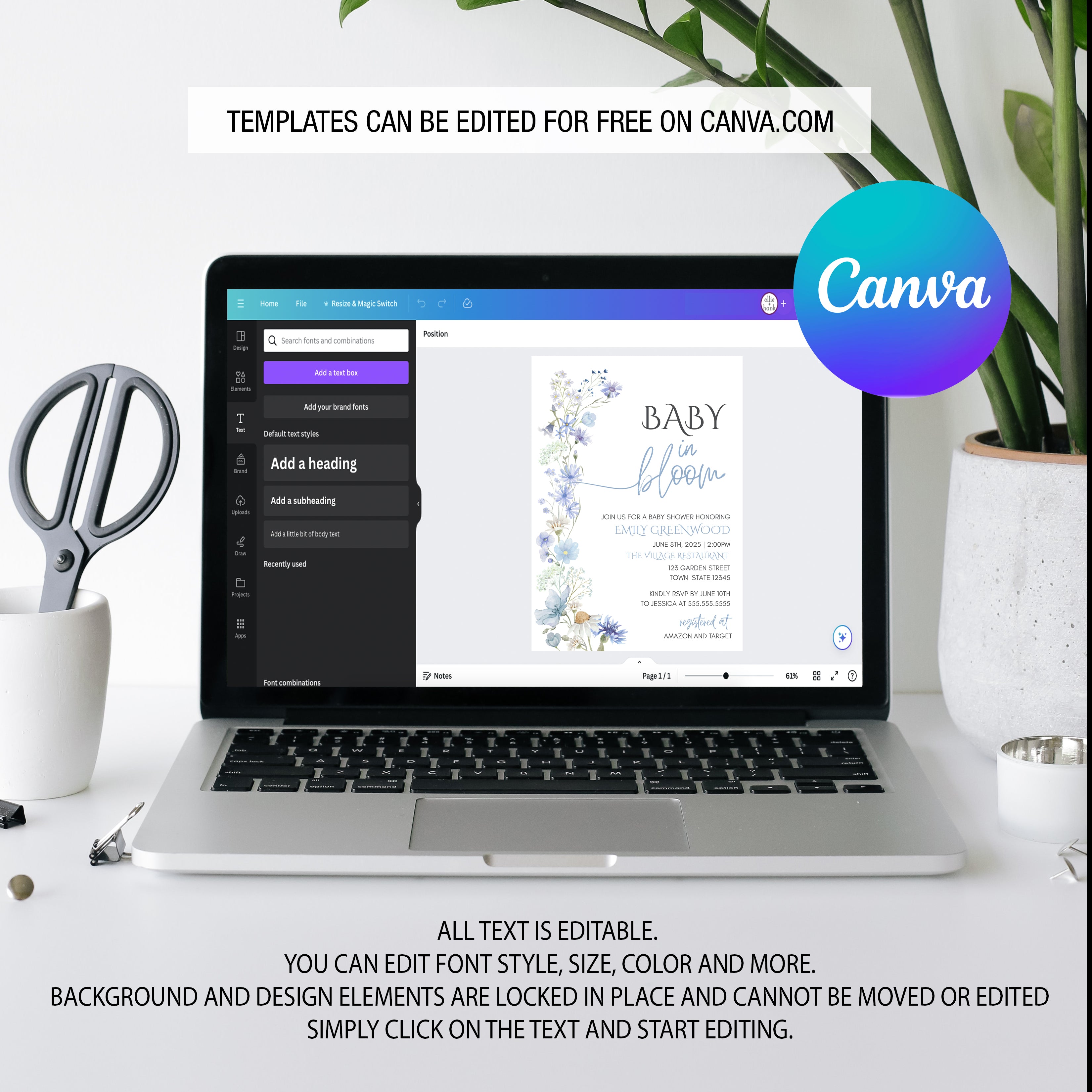 After purchase you will receive an email with a link to download instructions and links to your editable Canva template. Canva is an online design site that is free to use. If you do not have a Canva account you will need to sign up for a free account in order to save and edit your work. Links are included for the 5"x7" invitation template that can be printed once downloaded. Please get in touch if you have any difficulty whatsoever in receiving, editing or printing your files.