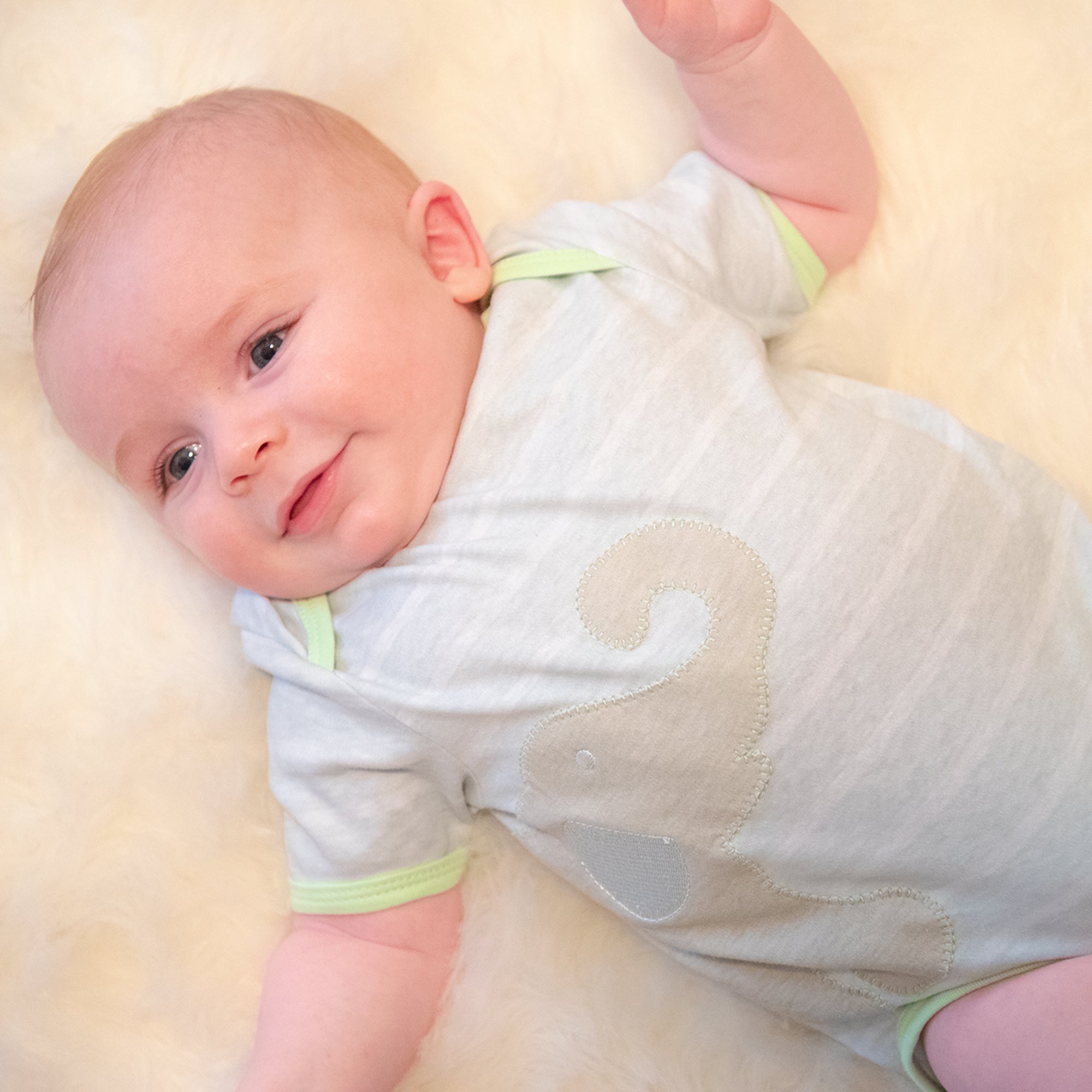 It's a zoo! This sweet alligator applique wraps from the front around back, polka dots to tail! This soft Pima cotton onesie features a light lime green stripe pattern trimmed with a soft pink binding. Great for summer and pairs nicely with our Alligator Pink Dot Pants for cooler days. Have fun playing dress up with your little one and show off their wild side with the Alligator Lime Dot Onesie! This adorable and versatile onesie features an alligator applique that wraps around from the front to the back, with polka dots leading all the way to the alligator's tail! Made with soft Pima cotton and trimmed with a delicate pink binding, this onesie is perfect for warmer weather and pairs beautifully with our Alligator Pink Dot Pants for cooler days. It's sure to be a hit with both baby and parents alike!