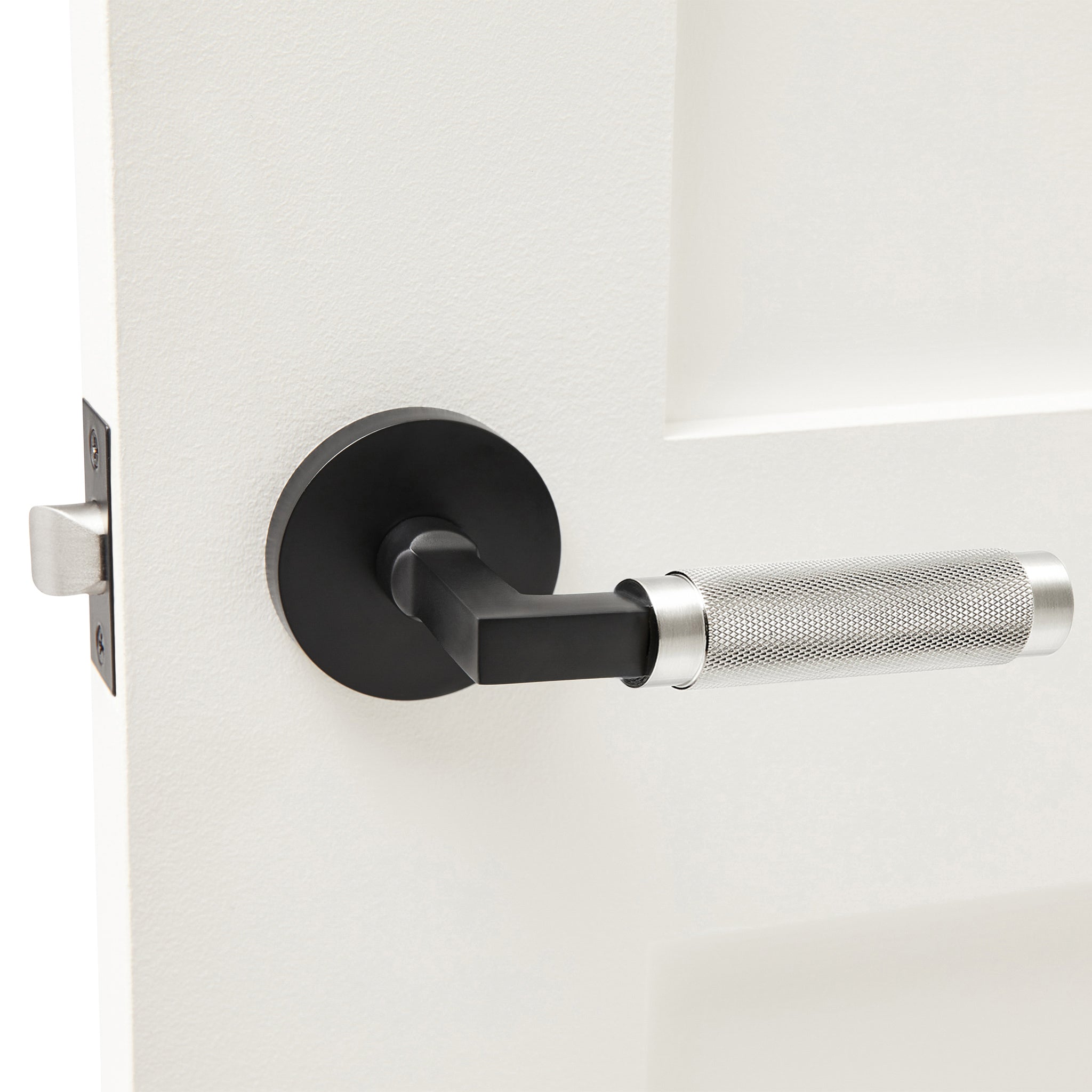 This door handle has a contemporary style and it is paired with our round rose/backplate. The lever is knurled in a diamond pattern with smooth edges. The finish is matte black and satin silver.