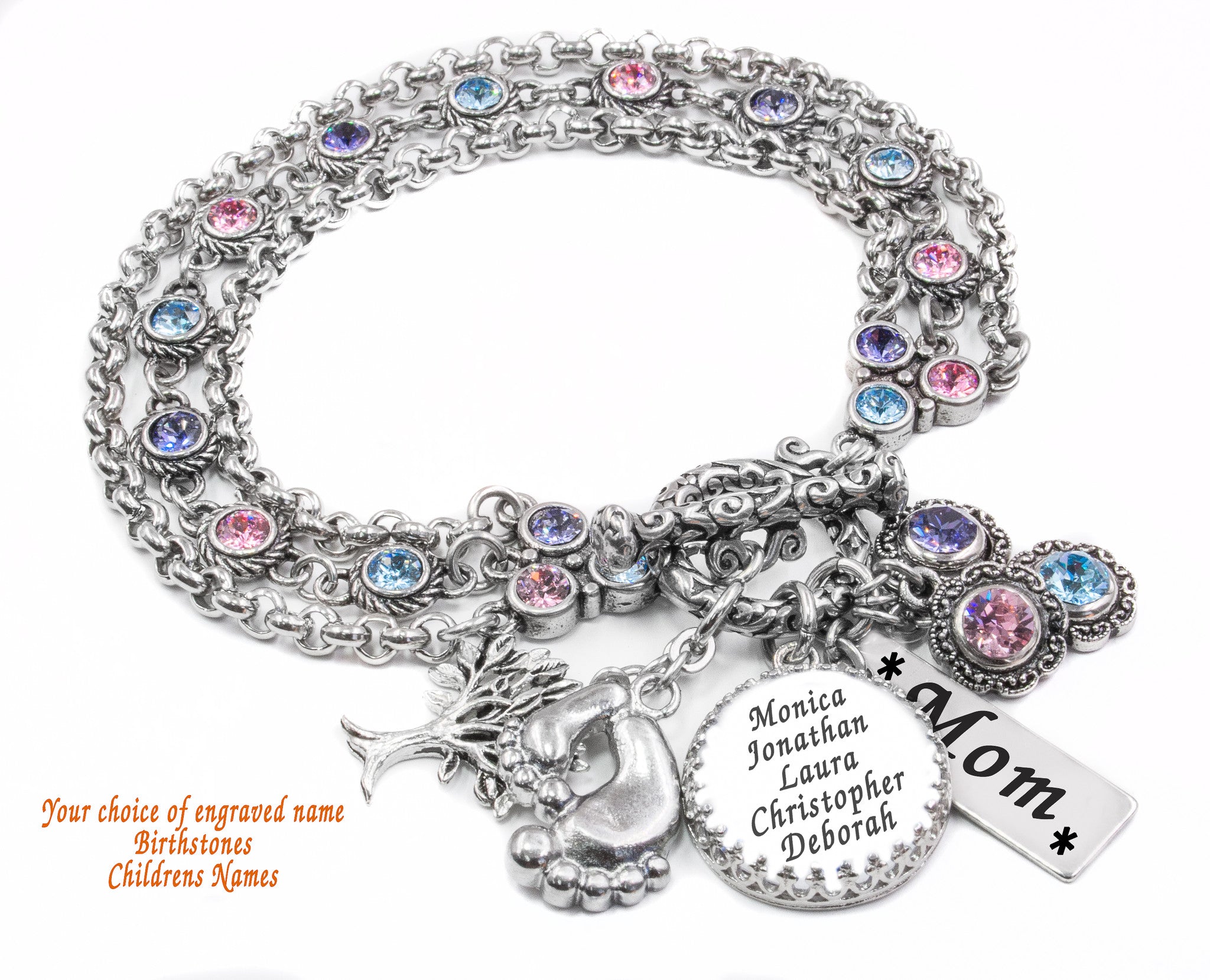 Show mom how much you care with a Mother's Birthstone Charm Bracelet just for her. Artist Created with your choice of children's birthstone crystals charms and throughout the chain, including engraved silver charms. Personalize the bracelet with up to 7 children’s names engraved on a sterling silver pendant, a birthstone charm for each child, a custom engraved rectangle charm, and two silver charms of your choice from our catalog. View our charm catalog here to select your two charms.