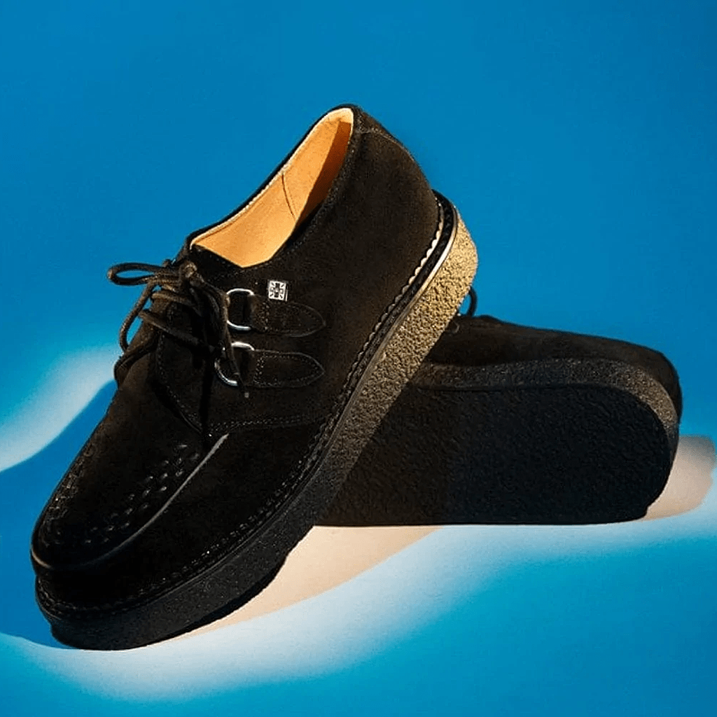 T.U.K.'s premium creeper in black suede . These round-toe creepers feature a natural rubber sole with crepe finish and stitched welt detail. They feature leather lining with removable memory foam insoles for extra comfort. The sole height stands at approximately 3.5cm at the heel and 2cm at the toe.