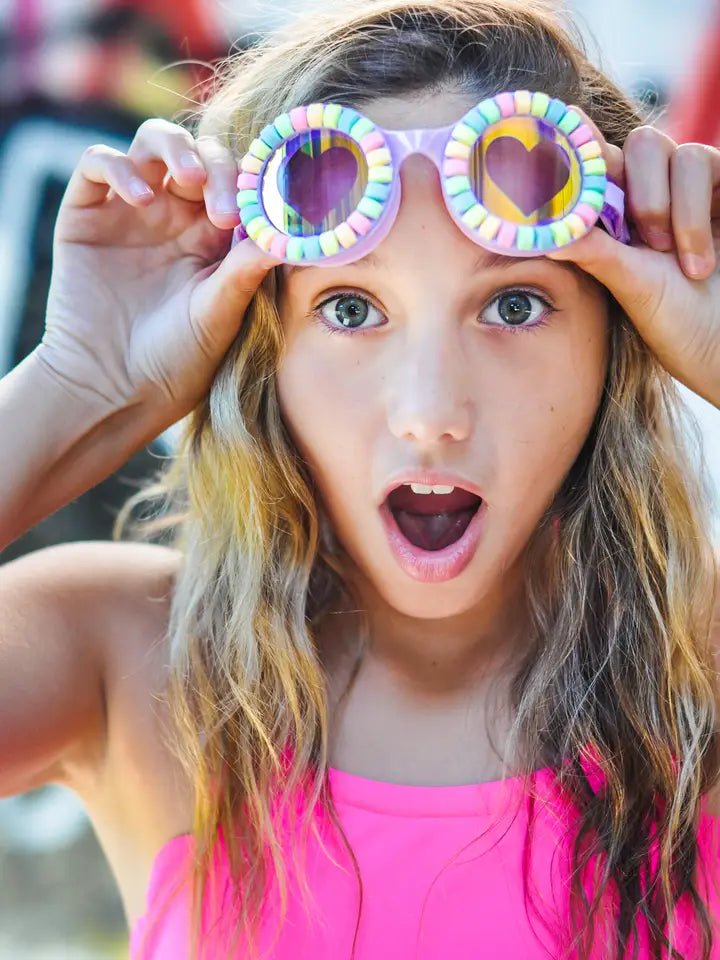 Candy is dandy with Pool Jewel! Themed after retro candy bracelets, Pool Jewel is wrapped with faux candies. To express more love for candy, this style is finished with a heart printed lens. Pick your color below, pink or purple!
