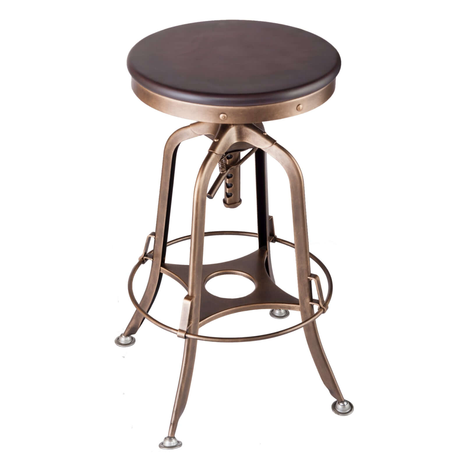 The perfect replica of the Classic Vintage Draftsman Bar Stool. The use of the Smoke Black Wood Top and French Brass Legs creates a look that is Modern, Contemporary, Traditional and Industrial. Body has been manufactured from Iron. An adjustable mechanic lever has been added for height adjustment, creating a new level of convenience.