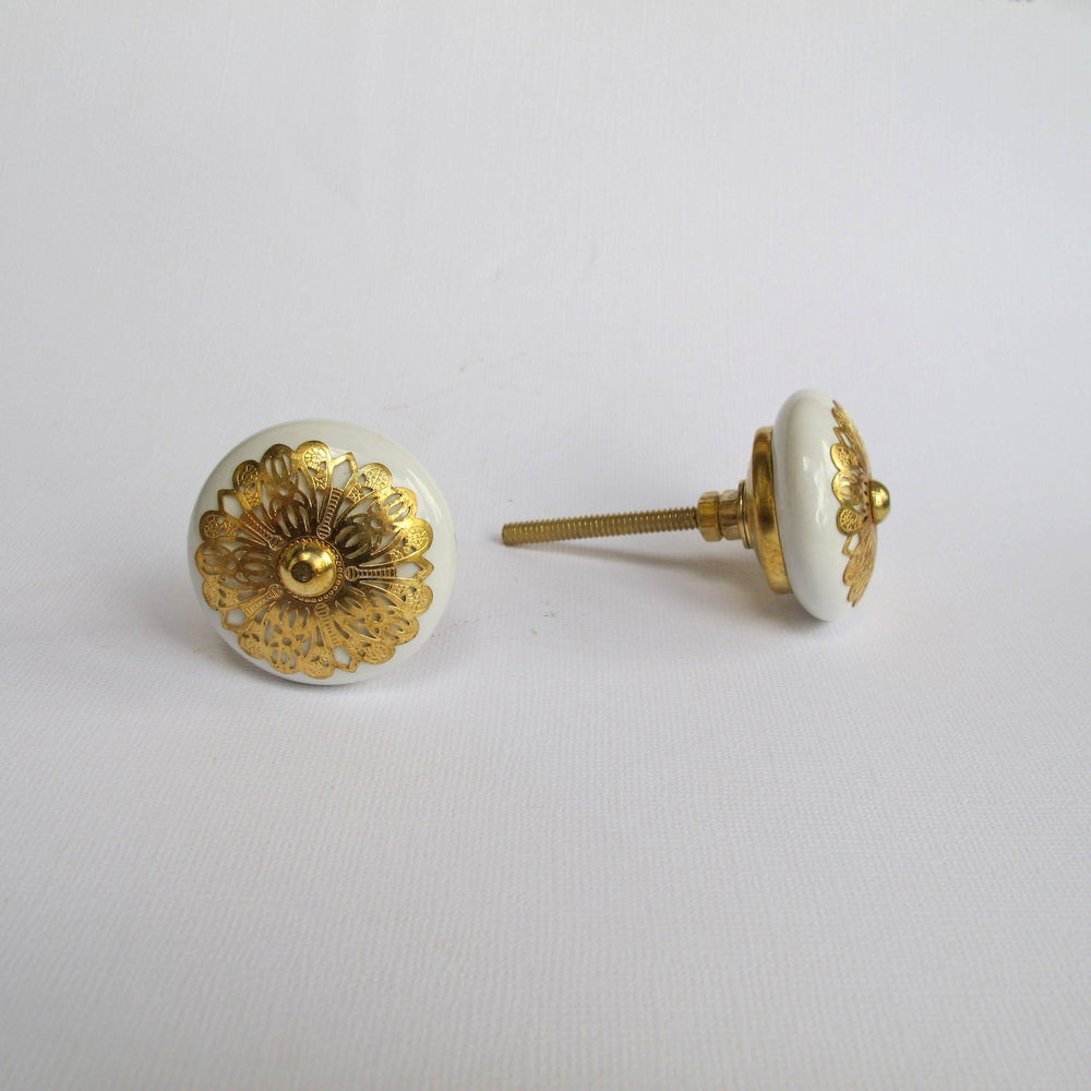 Intricate gold lace filigree design resembling butterfly wings on white ceramic round knob. Vintage style knob, classic design. Beautifully detailed, one you are sure to love! White ceramic knob with gold metal design overlay.