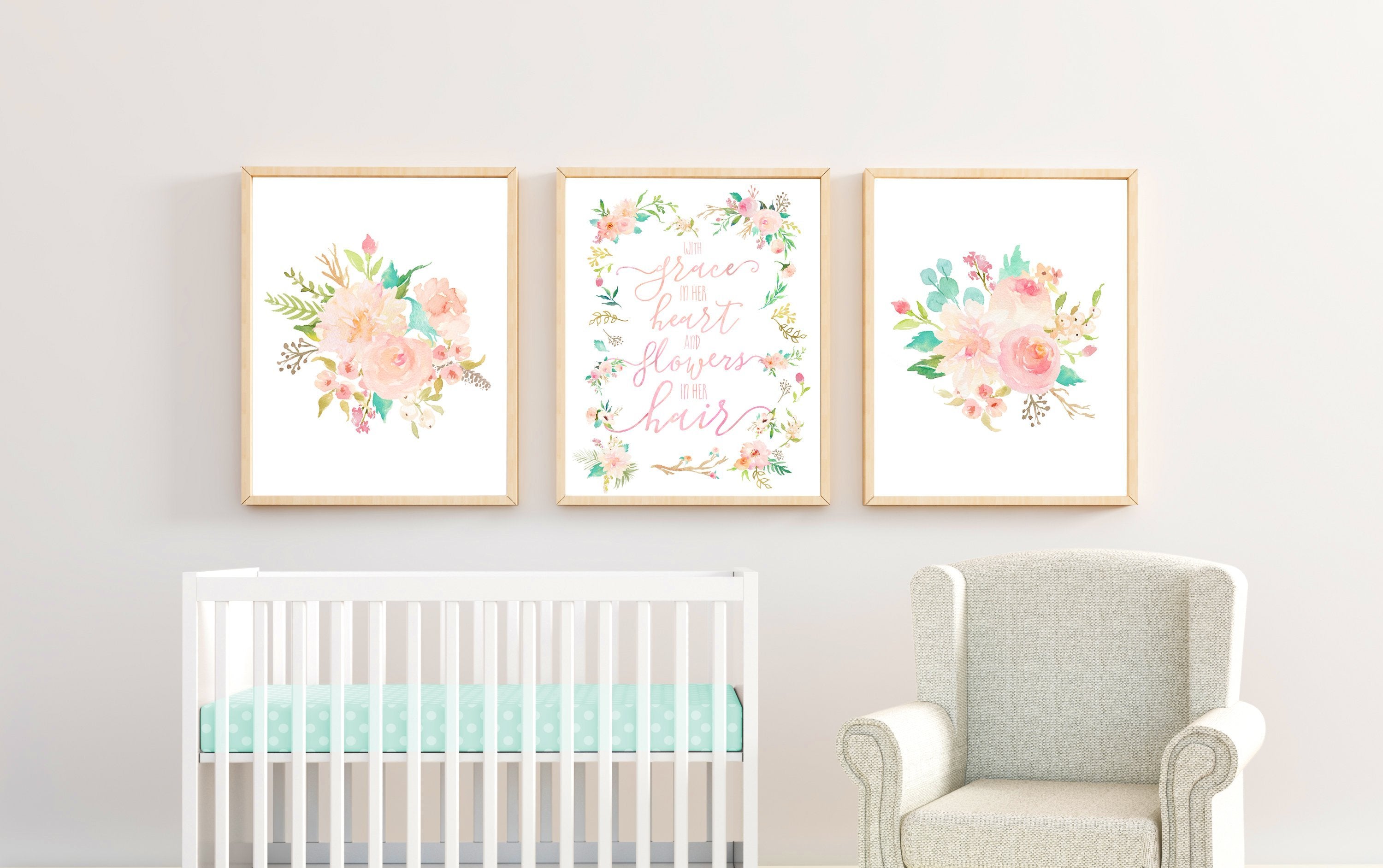 "With Grace In Her Heart and Flowers In Her Hair" from the Floral Whimsy Collection, featuring beautiful watercolor florals and a whimsical modern calligraphy quote in our popular mint and blush colorway
