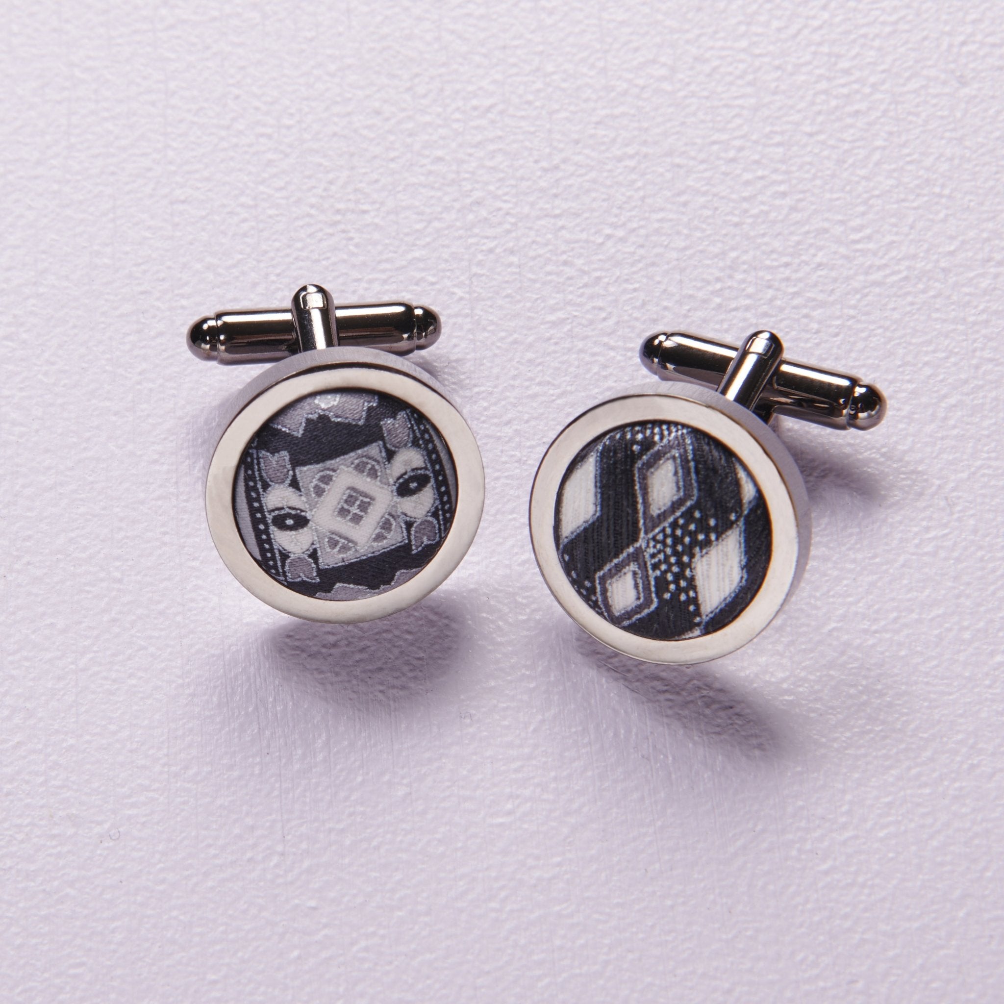 Each button is cropped, cut, mounted and set in our studio. The cuff-link findings that frame the medallions offer a clean, modern counterpoint to the vintage fabrics. They feature an easy to use, pivoting toggle-back to go through the shirt cuff. John selects the metal color to best enhance each individual set of buttons.