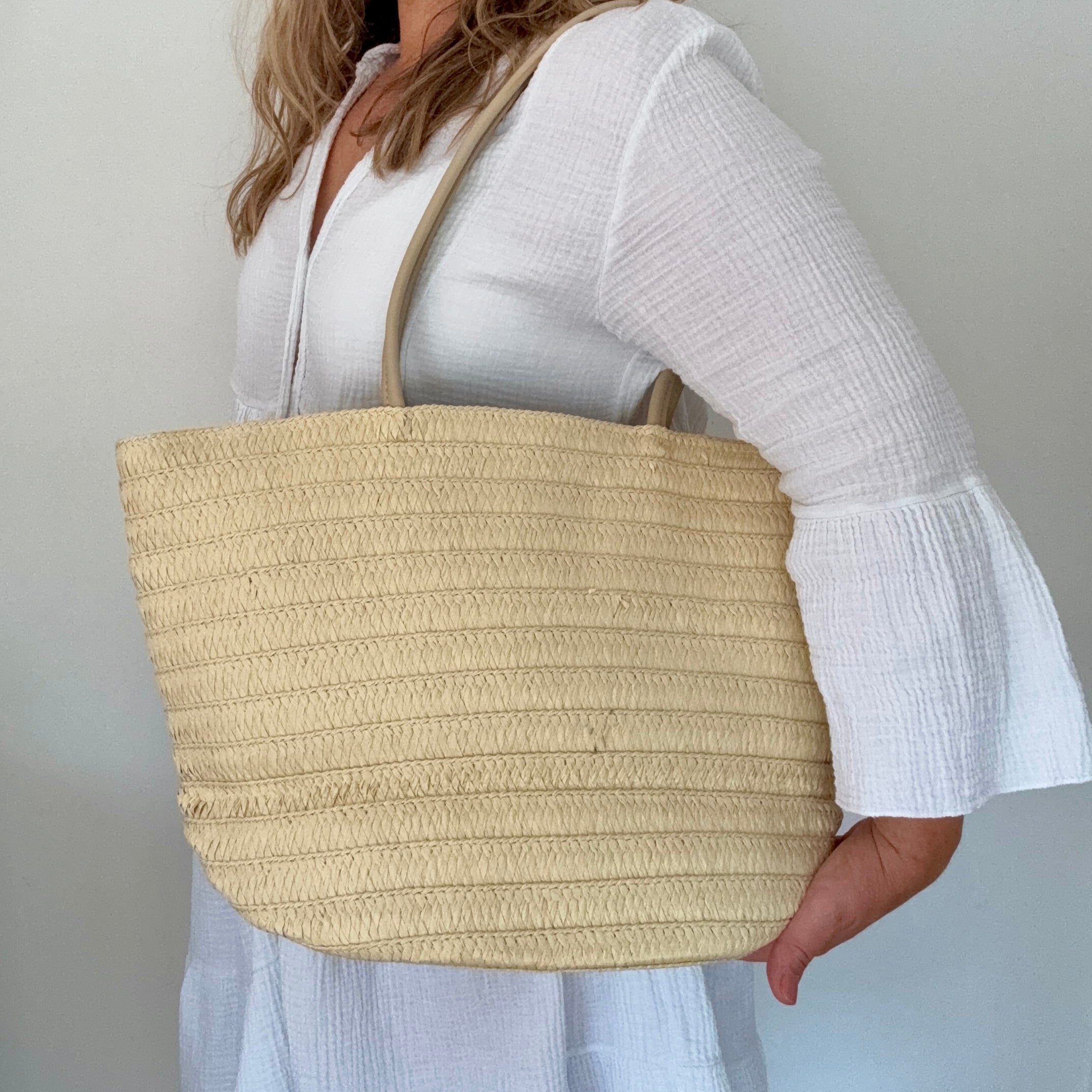 Cream Raffia Tote Bag with Cream PU handle strap. The bag has a waterproof lining, zip top fastening & an internal open pocket.