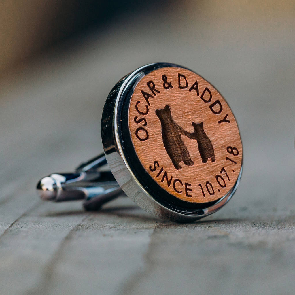 Silver plated with beautiful engraved cherry wood, these personalised wooden cufflinks make a perfect gift for Dad off their favourite little bear cub.