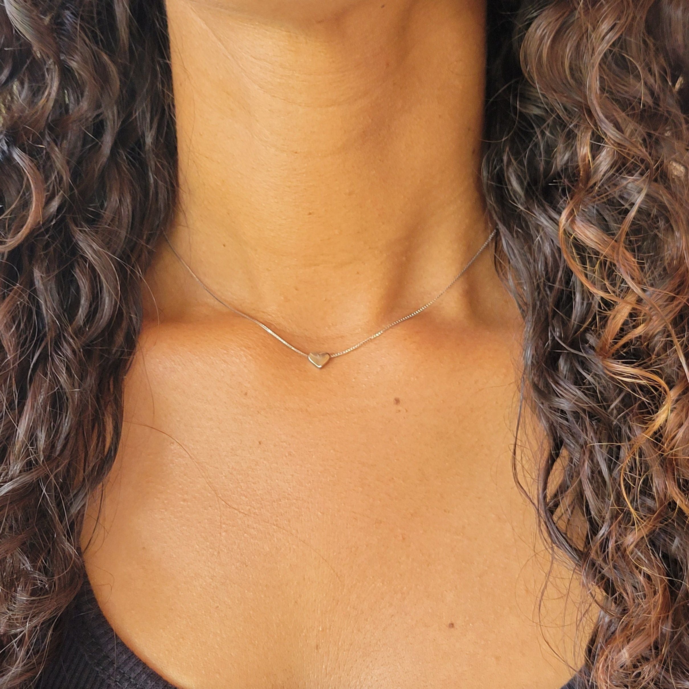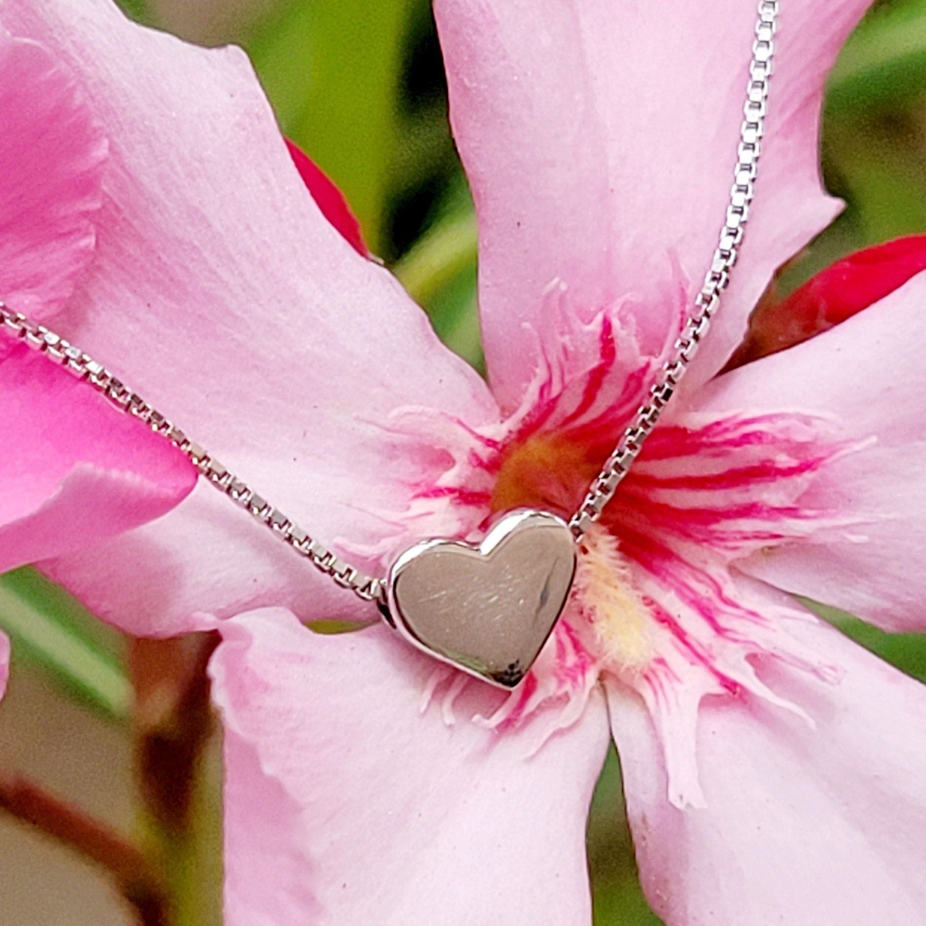 Dainty, elegant, sterling silver heart necklace hangs perfectly on a box chain. A heart symbolizes love, friendship, and affection. This exquisitely polished heart will brighten that special someone's day by showing them how much they are adored or remind you of someone you care about.