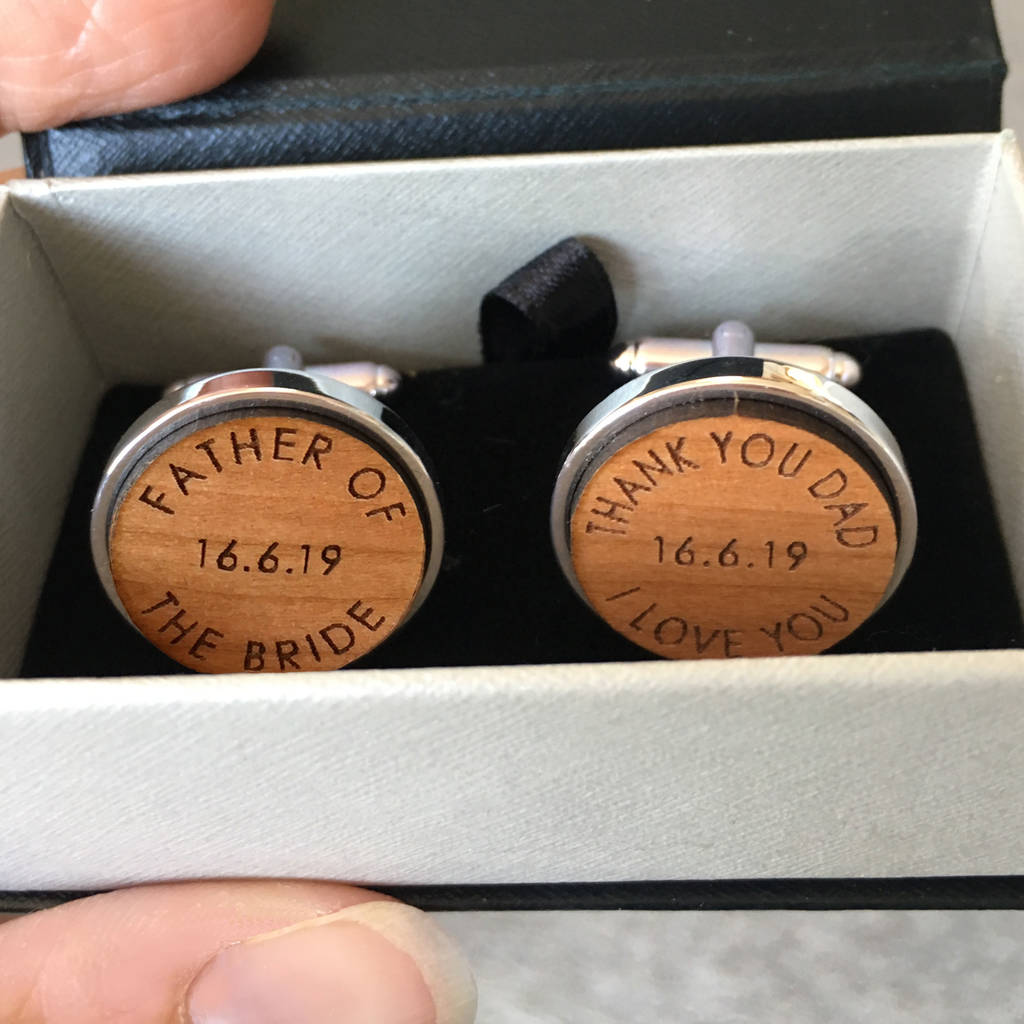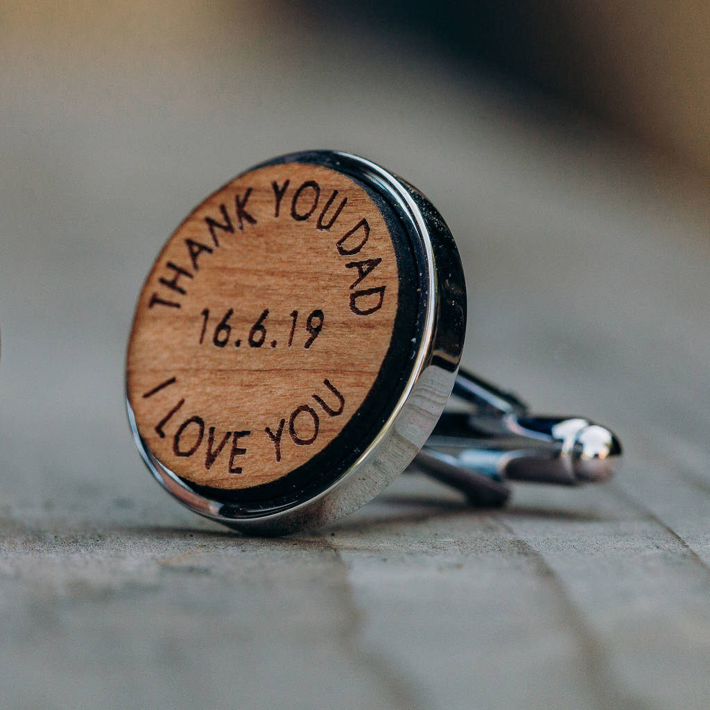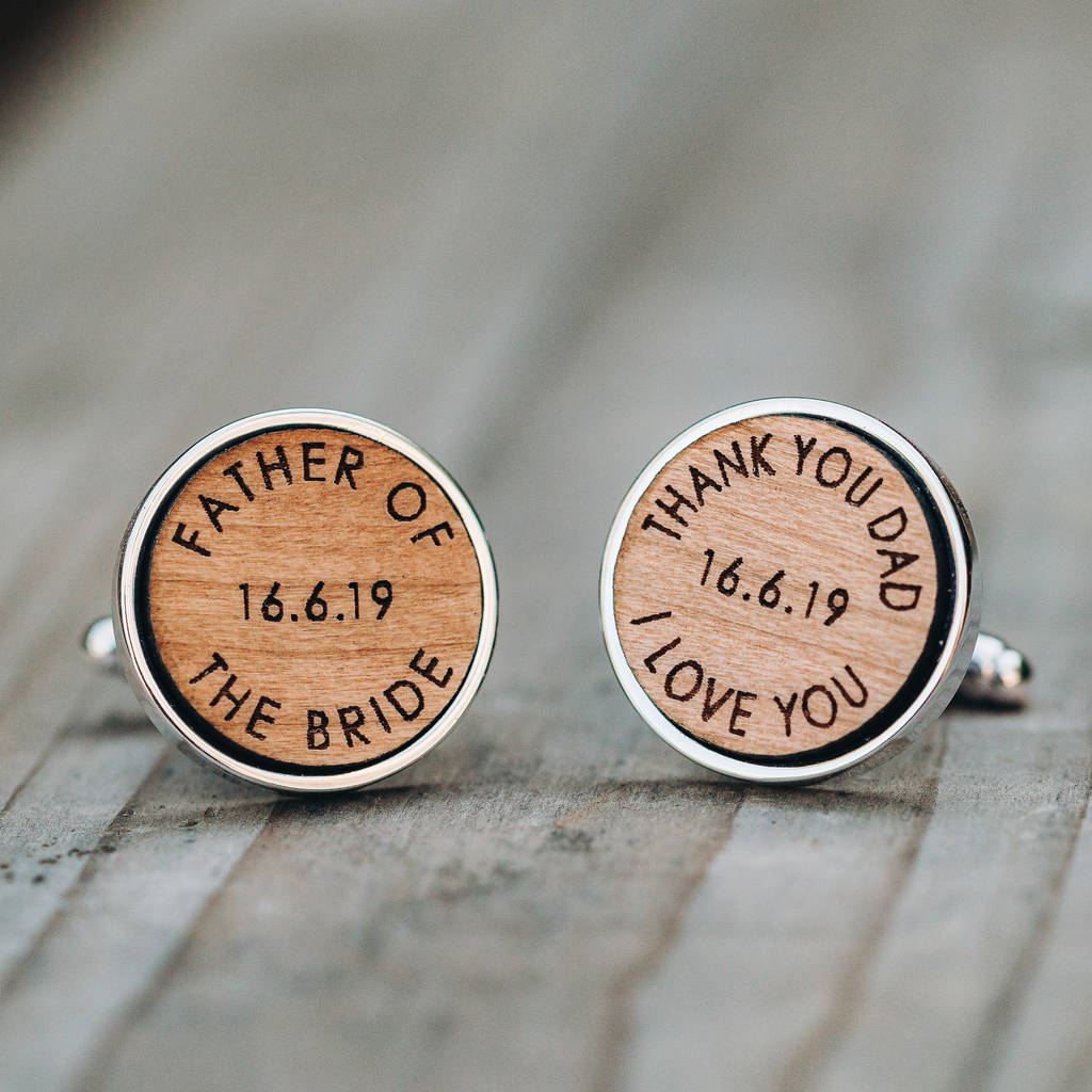 Stunning Father of the Bride wooden wedding cufflinks with a special message of thanks for Dad along with the date of the big event.
