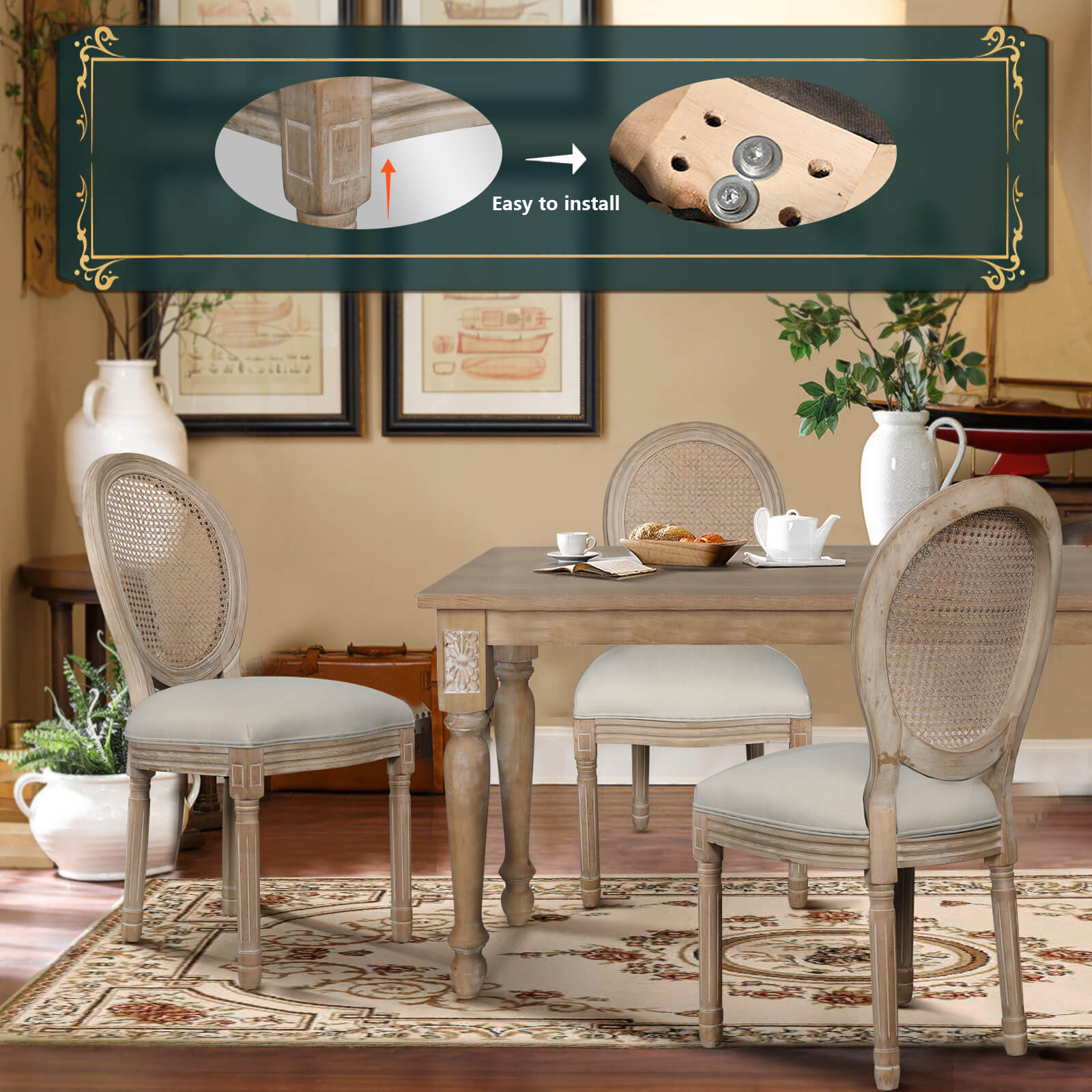 EXQUISITE RETRO STYLE -NOBLEMOOD framhouse dining chairs with finely carved solid wood structure. The delicate pattern in the legs add elegance and nobility to your dining room and create a different French romance at your home
