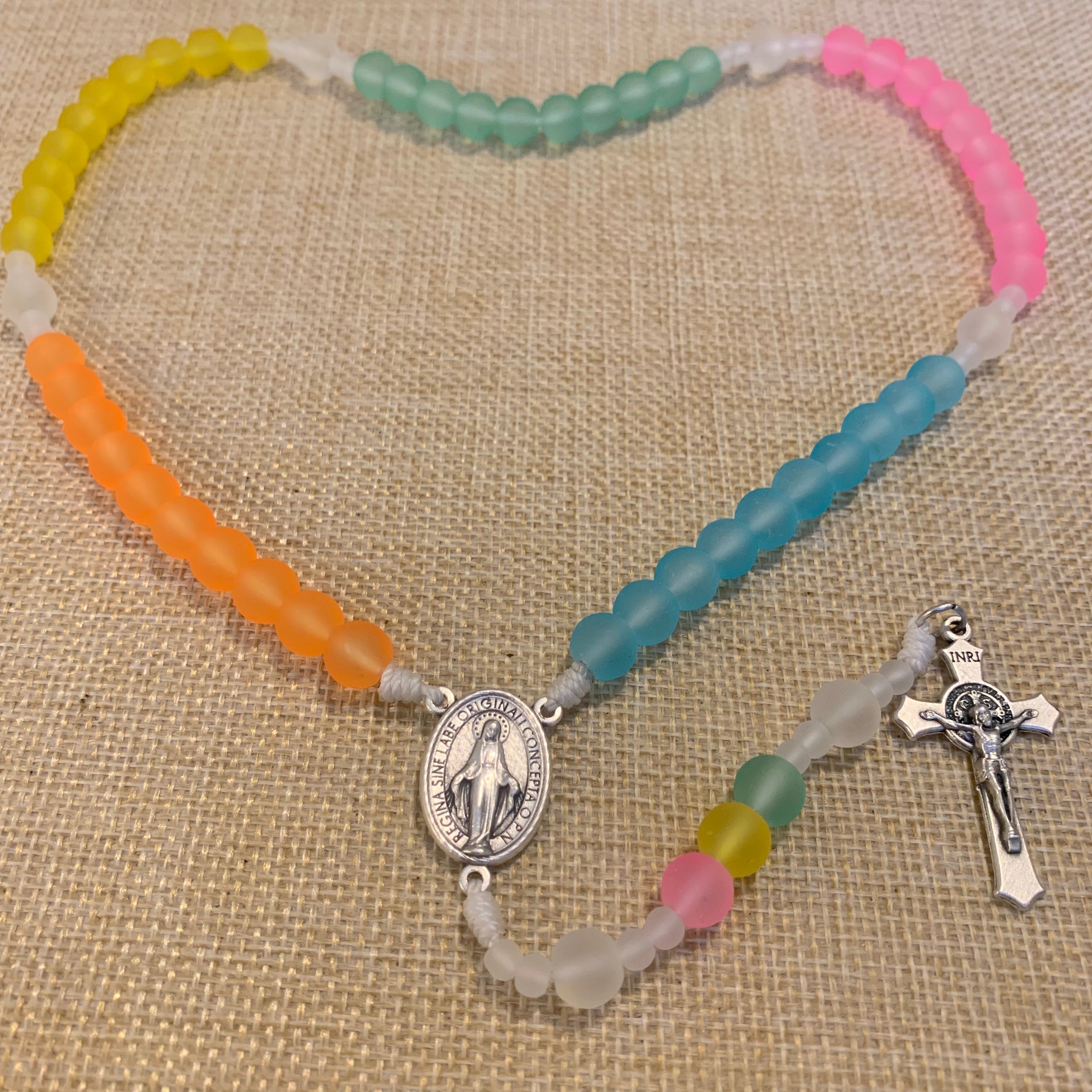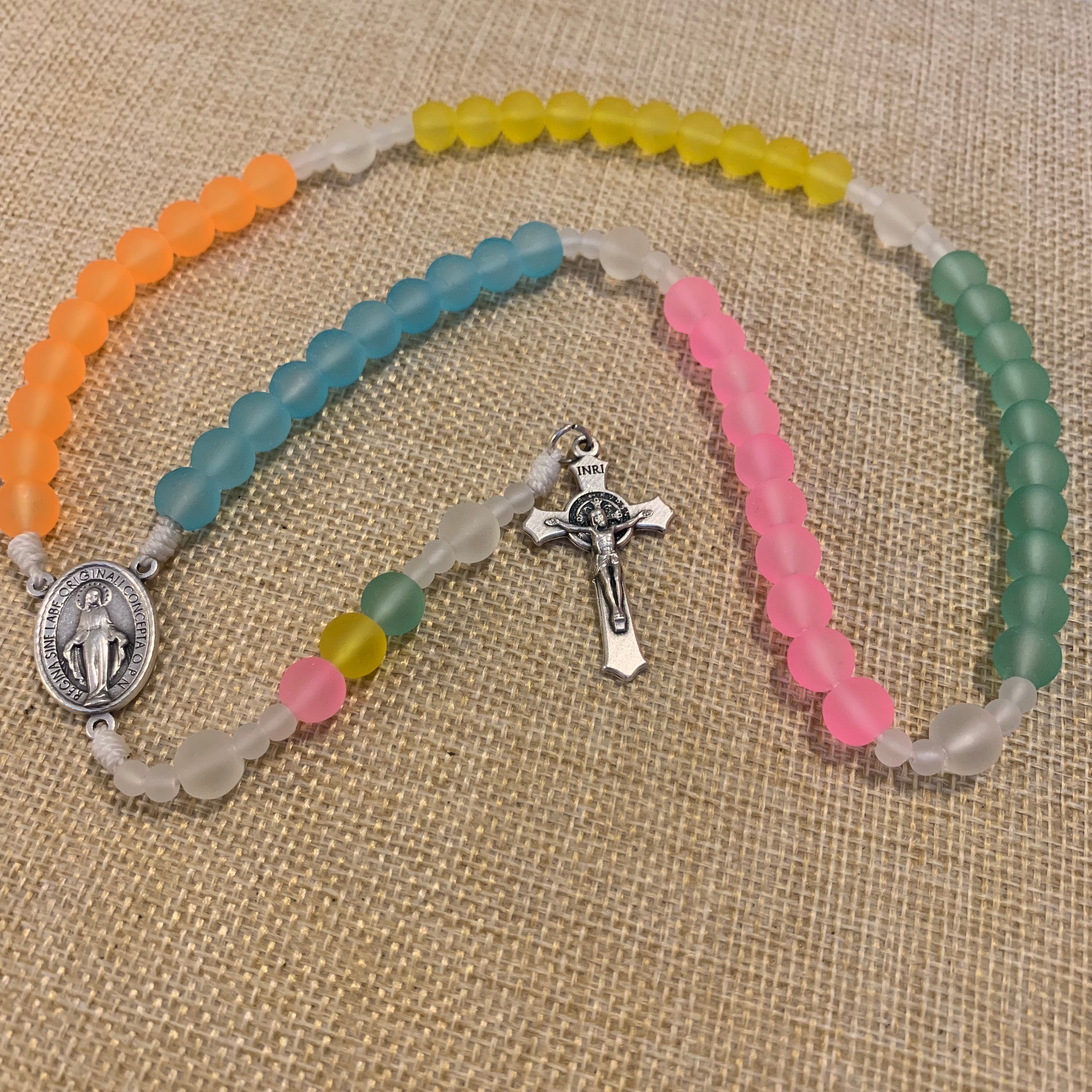 Our frosted starburst rosary is made with 8 mm smooth sprayed frosted matte glass beads. The center has a beautiful miraculous medal. It begins with a Saint Benedict Crucifix imported from Italy.