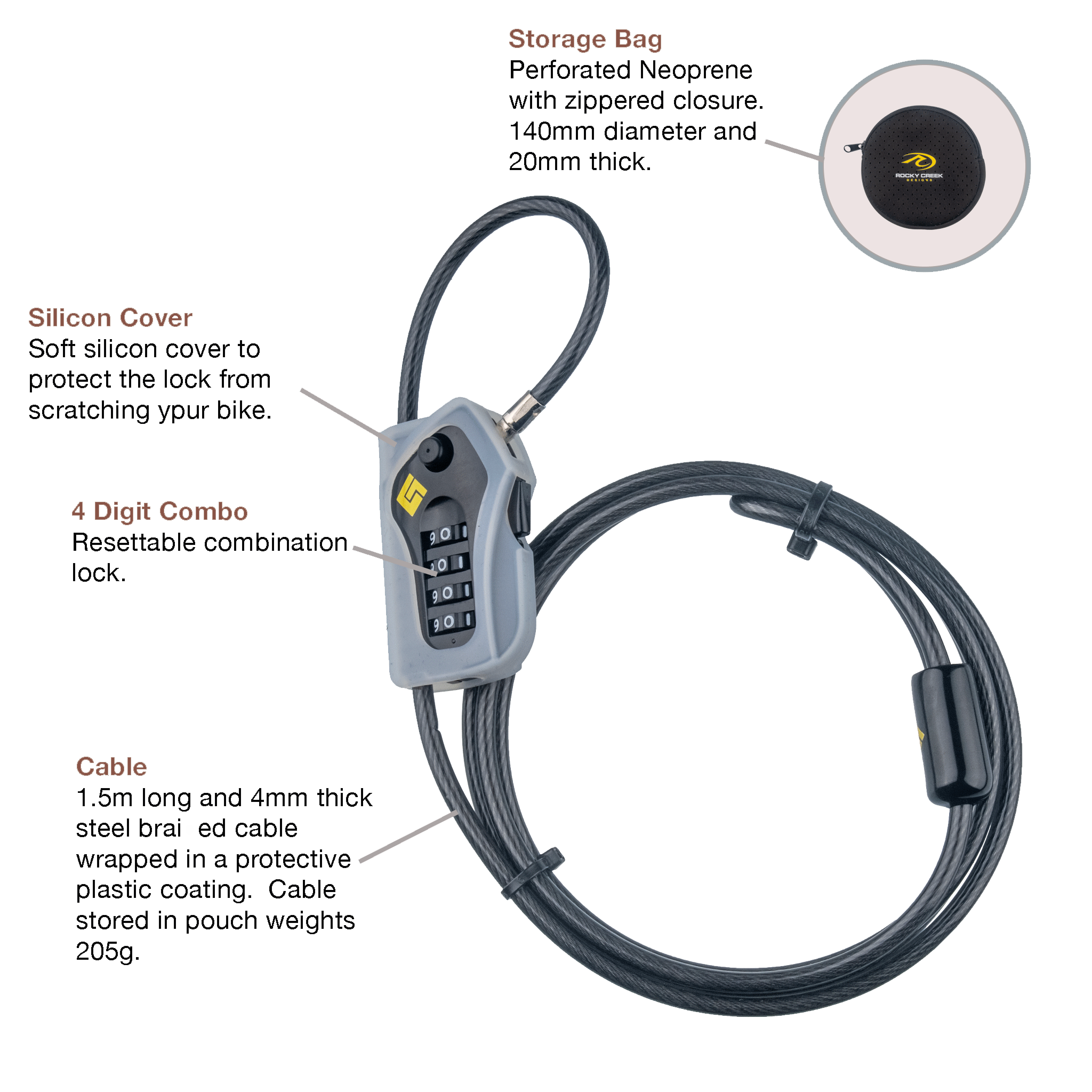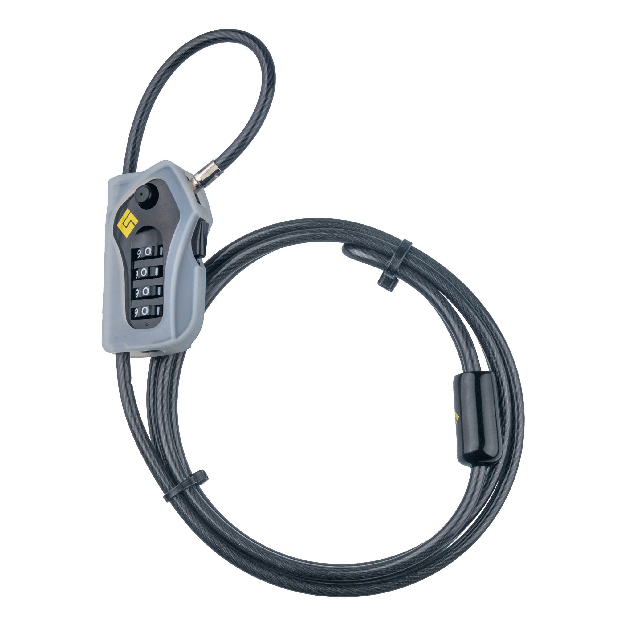 Secure your helmet, jacket, backpack or anything else to your bike using the GearLok Lock and Cable; it's simple! Thread the 150cm long braided galvanised steel, plastic-coated cable through your bike’s frame, handlebar or grab rail. Slip the cable end through its loop and around the items you want to secure. Insert the end into the lock slot, adjust the length by sliding the lock up or down, press the Snap Button and scramble the 4-digit dial—you’re done! NO more lugging your jacket and helmet around.