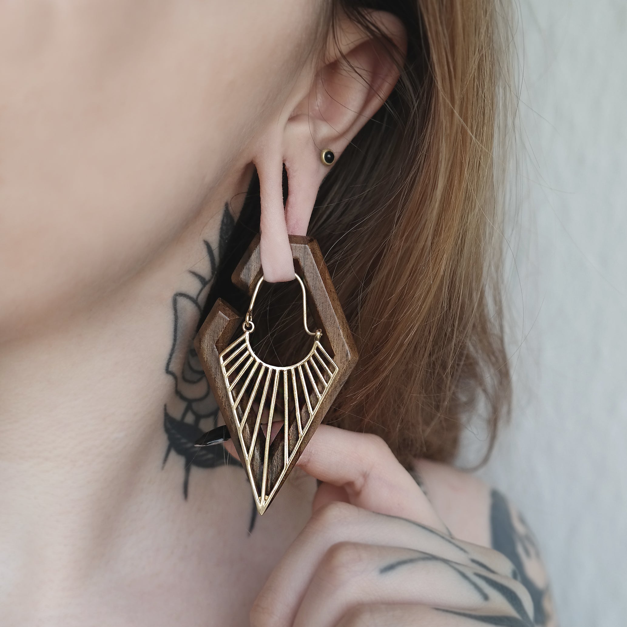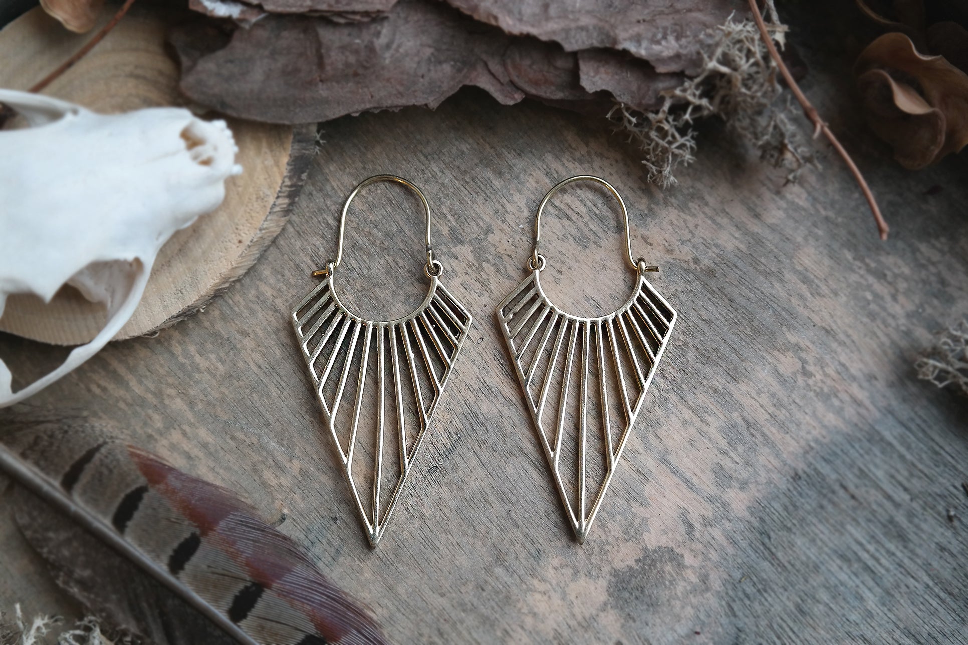 Gold Pointed Triangle Hoops. Golden polished brass earrings. High quality geometric triangle design. They fit comfortable through any flesh tunnel and can be worn like normal earrings.