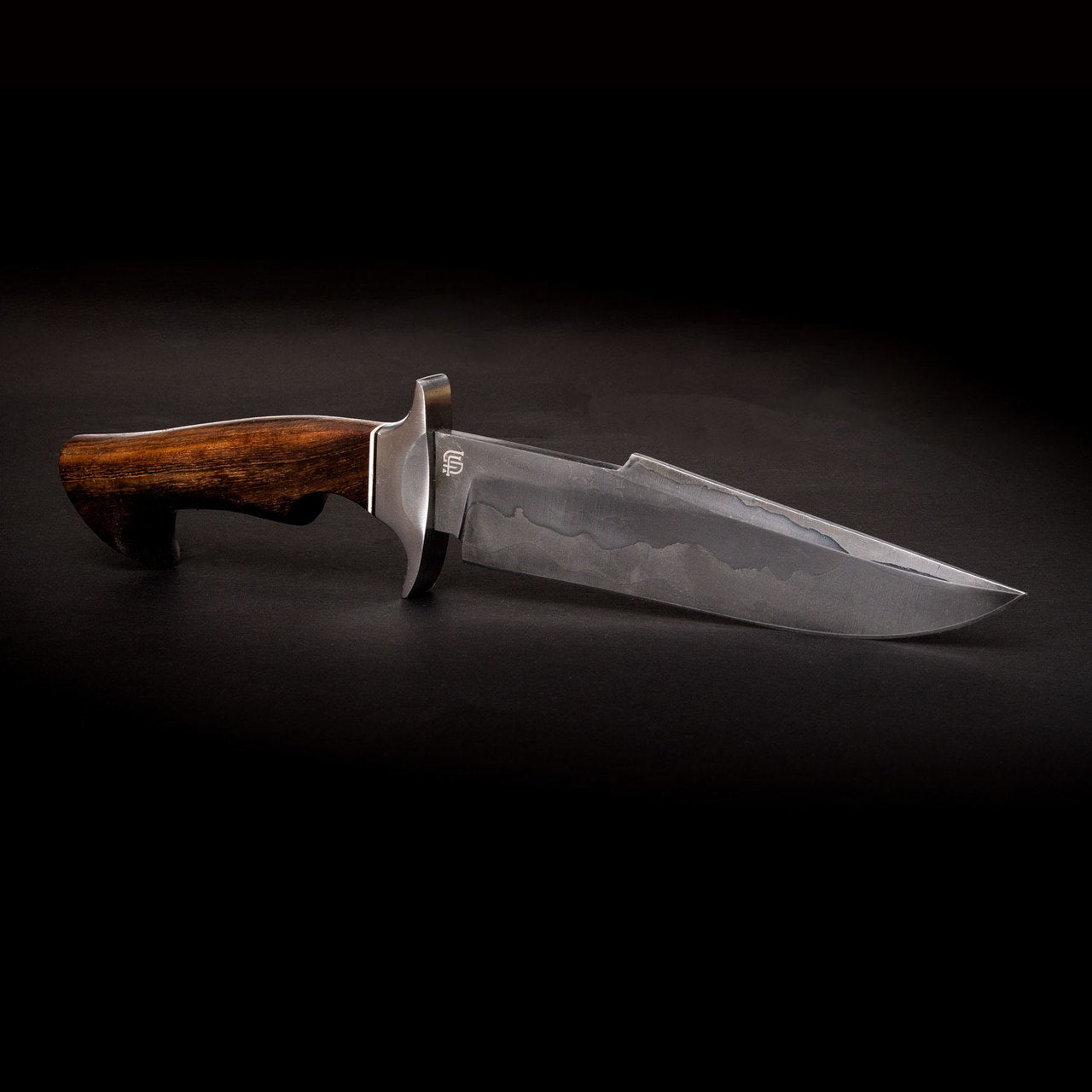 Our hunting knife design is inspired by the mountain men and frontiersmen who tried to tame this land. The 7.5” blade has a classic look with a slight drop point. The large stainless steel bolster will protect your fingers from sliding onto the blade and a large tali wood handle will give you superior control of the knife, even while wearing gloves. The overall knife measures just over 12” and weighs 11 ounces without the sheath. The sheath has been custom designed to be worn holster style under your arm. This protects the knife from the elements but also gives you quick access to the knife when you need it.