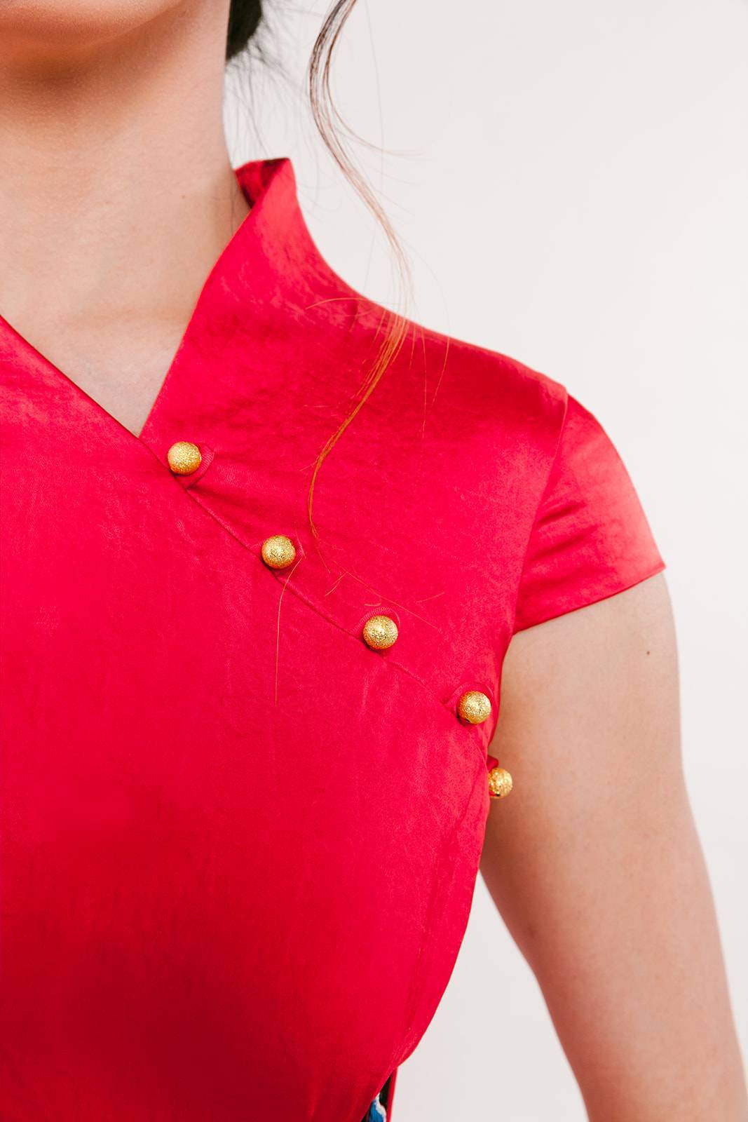 Crafted from soft silk fabric, this uniquely designed cheongsam features an open collar, beautiful gold buttons, and vibrant embroidery. It also features a sexy curved side slit. This dress is made for the modern woman who seeks unconventional things.