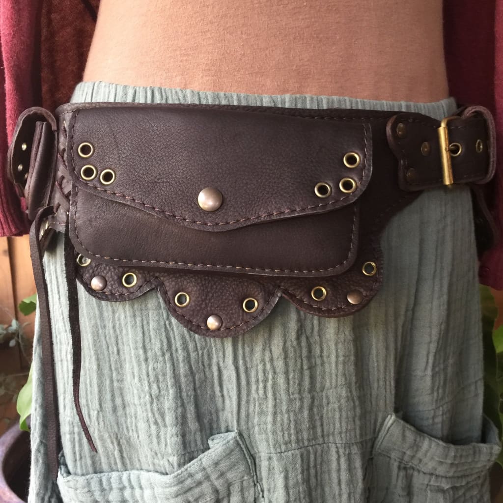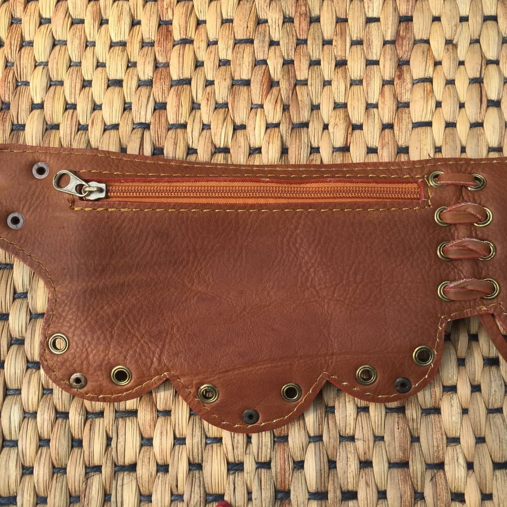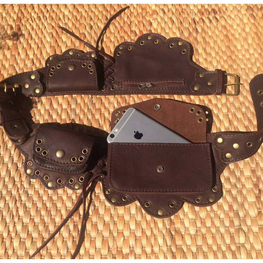 This gorgeous leather pocket belt is handmade using the highest quality leather and antiqued brass detailing. Its unique styling features two brass buckles instead of the usual one. Having one buckle in the front and one at the back allows for maximum fit adjustments and is very flattering. These belts are meant to sit low on the hips. The belt has 3 pockets with snap closures that will securely hold your smart phone ( iphone 6 ) and many of your essential items. Two inside zipper pockets keep your money, cards and other personal items safe. It has fantastic Laced Leather detailing on both sides that can be worn loose or tied. Being "hands free" while having all your important things stored safely on your body is a great feeling! A must for traveling, Events & music festivals and just everyday life. Please message us with any questions ~