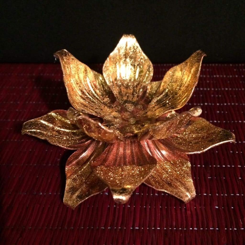 This lovely gold-leafed Lotus tealight candle holder was handcrafted in Bang Khen, Thailand by a family of metal artists. It is a process of forging and shaping the flower allowing it to cool and then layering the gold leaf to create this beautiful work of art.
