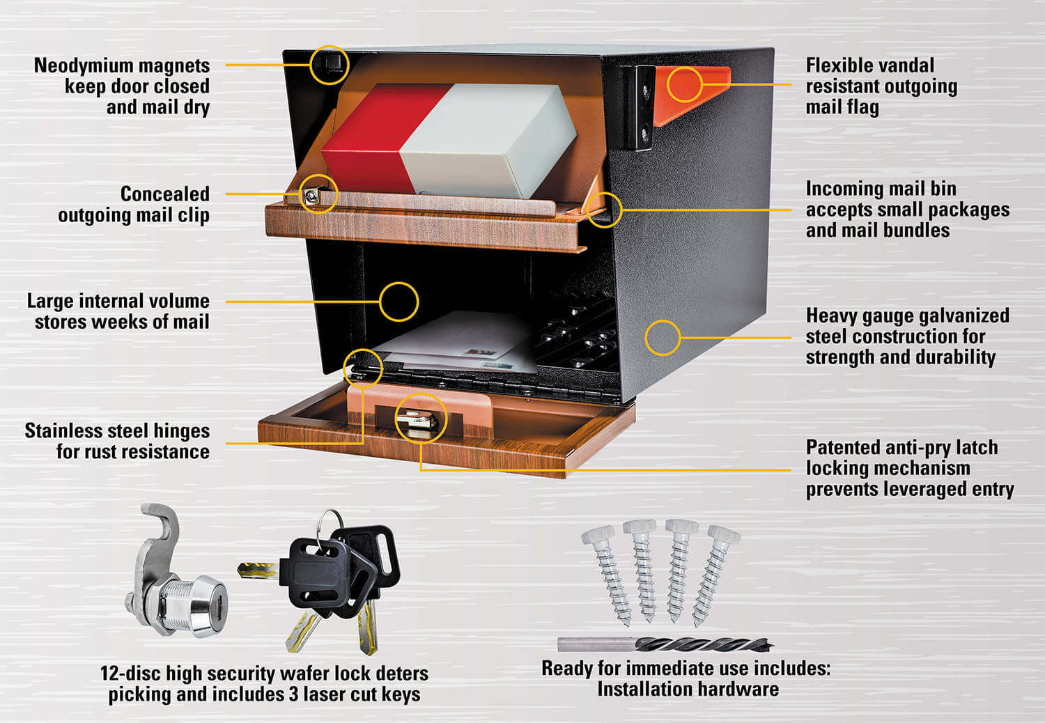 - Innovative baffle door design accepts mail bundles & small packages but prevents fishing