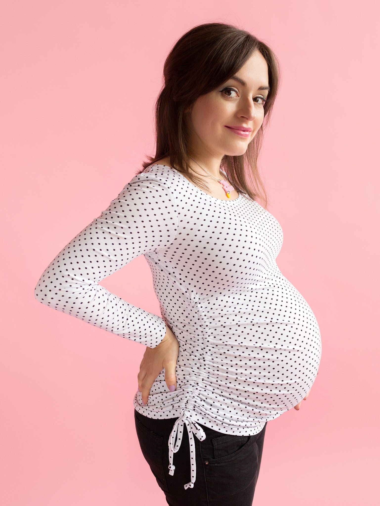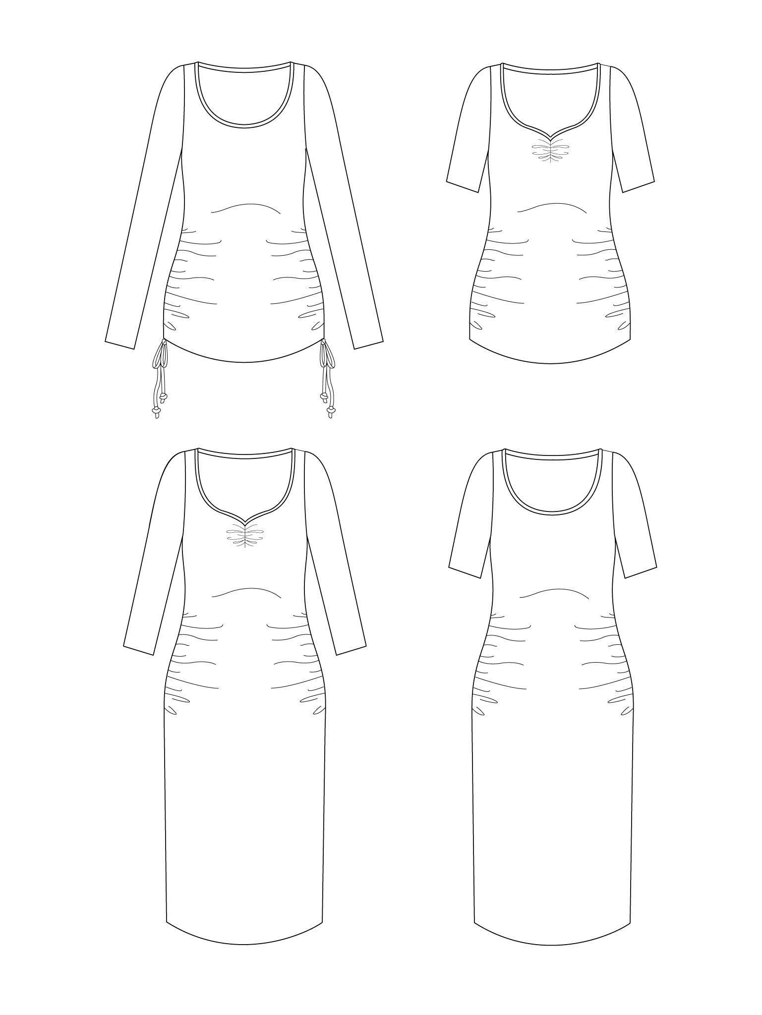 Choose from long-line top or knee-length dress, with plain or ruched sweetheart neckline, and cropped, three-quarter or full length sleeves. The stretchy, ruched front bodice creates space for your growing bump throughout pregnancy. The top version can also be made with adjustable drawstrings to gather or loosen the fabric as your shape changes.