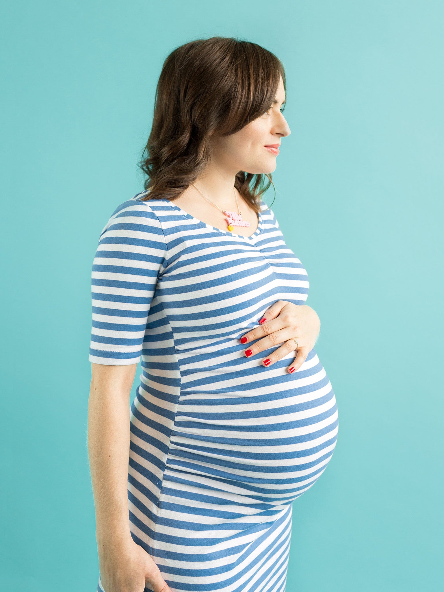 Show off your curvalicious mama-to-be shape in this close-fitting top or dress. Designed for stretchy jersey fabric, it’s speedy to sew, simple to fit, and comfortable to wear.