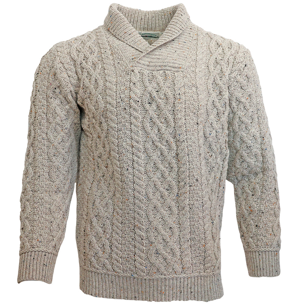 This men's shawl collar cable knit sweater is knit using traditional knitting patterns from Ireland.  This traditional Aran sweater features a pattern that combines cables, diamond, and basket stitches as well as a “V” neck shawl collar.  The perfect balance of timeless and modern this Irish merino wool sweater is sure to be a your new go to piece for staying warm this winter!