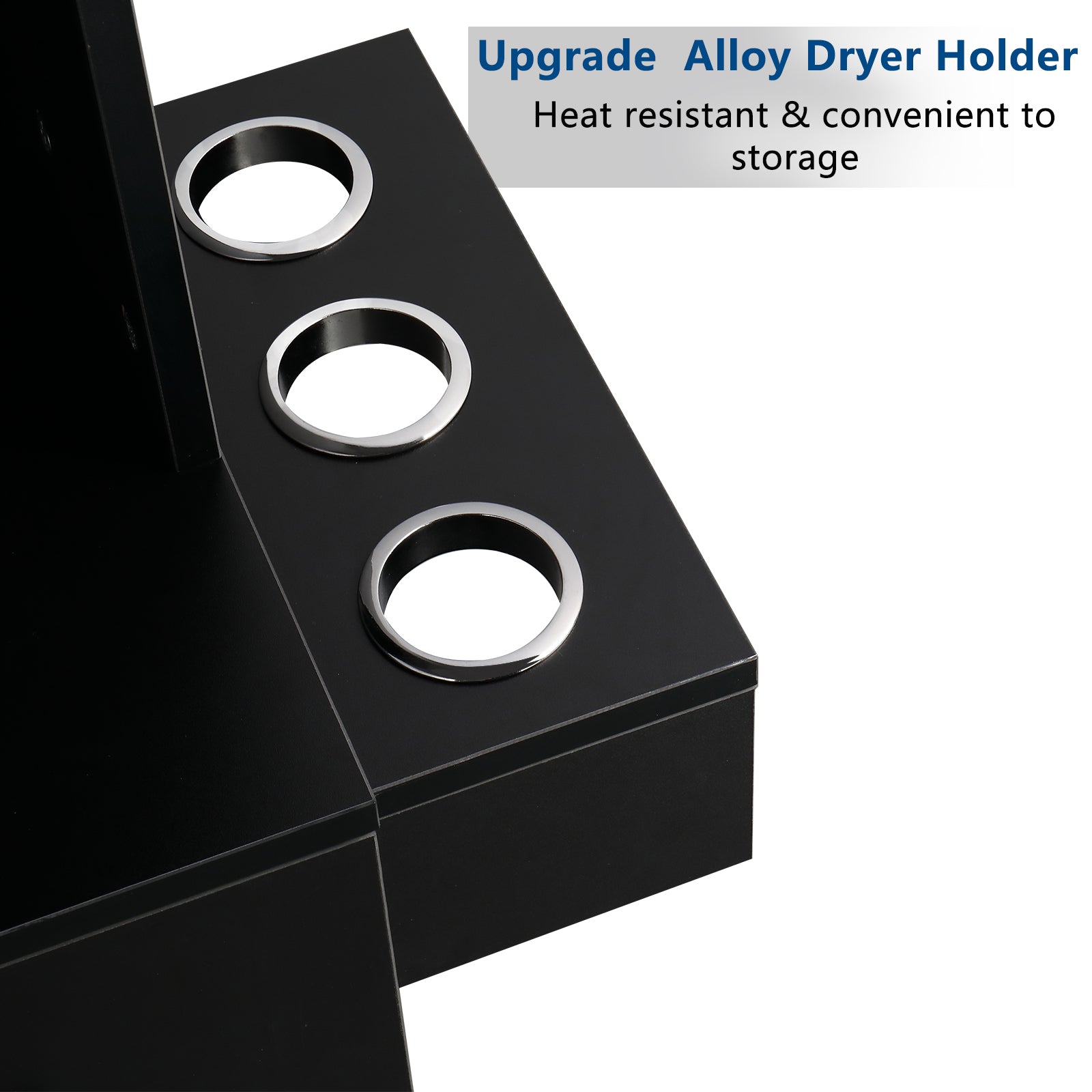 1.【Large Storage Capacity】- Featuring a three-tier shelf in the upper part, a central drawer, a spacious lower cabinet, and three hair dryer holders on the right side of the desktop, this cabinet provides ample storage for items of various sizes.