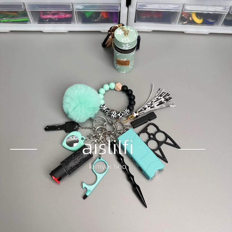 Sprayer, Kubaton, Cat Ears, Door Opener, Whistle, Key Cutter, Window Breaker, PomPom, Bluetooth Tracker, Flashing Light, Beading, Lipstick Bucket