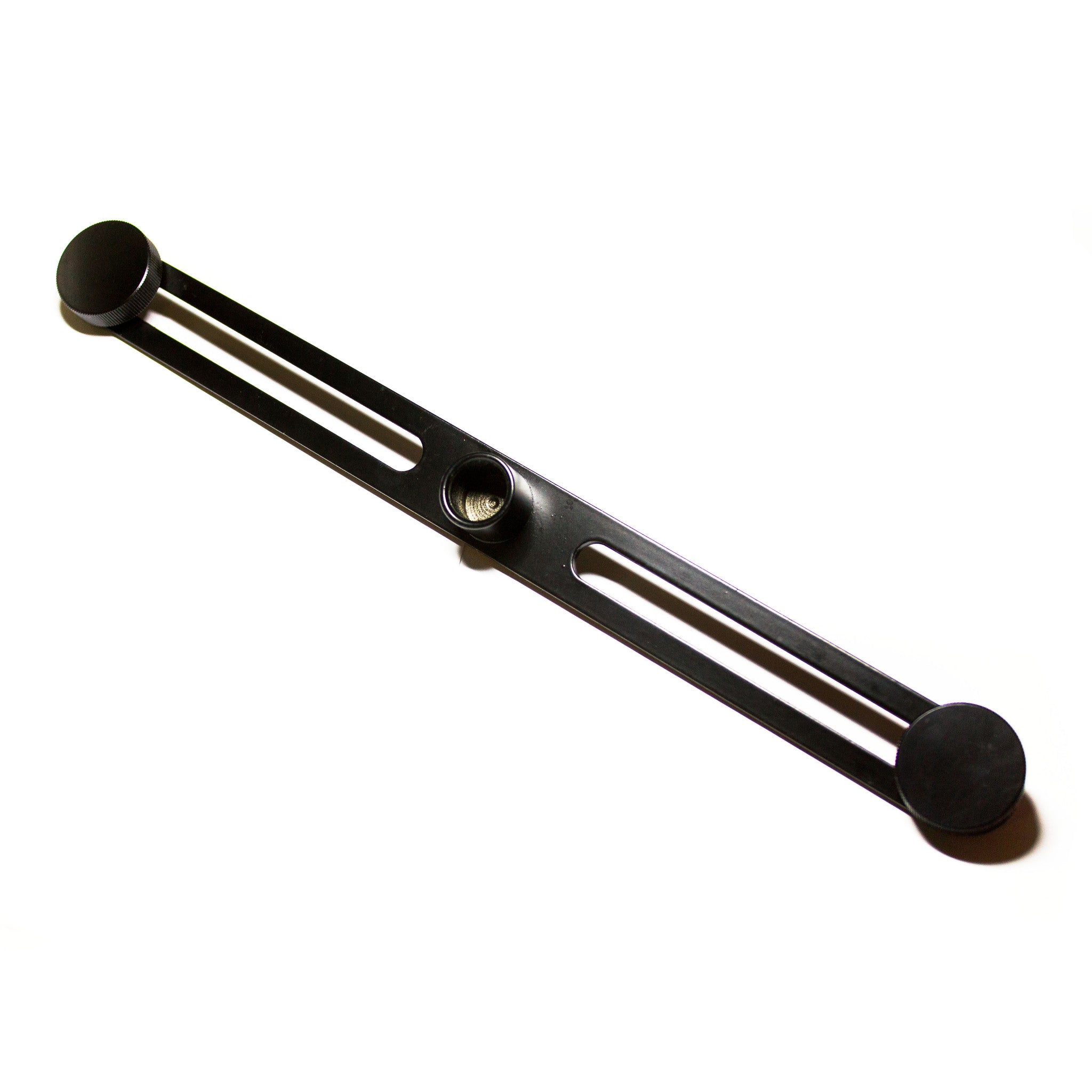 Easily and securely set up two microphones as a stereo, Blumlein pair. Our Blumlein bar features two adjustable adapters for connecting shock mounts (not included) and one for connecting to a mic stand.