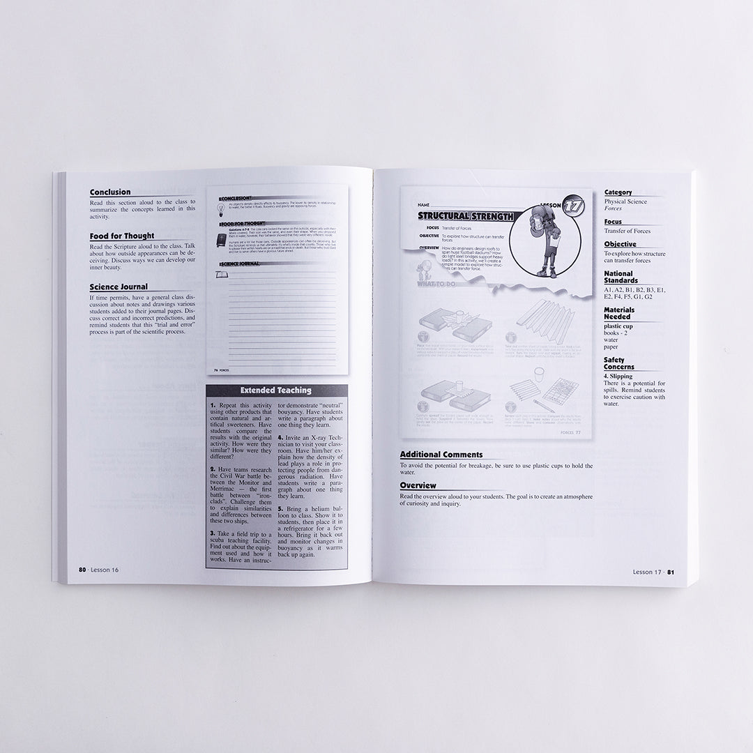 Lessons are designed to model the way scientific study works in college laboratory classes and beyond. The week begins with the teacher guiding students through a hands-on activity that introduces a fundamental scientific principle, with detailed instructions provided for each weekly activity. Questions and suggested answers are provided to assist students in recording and analyzing their findings.