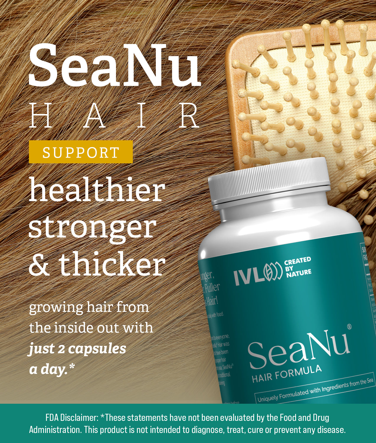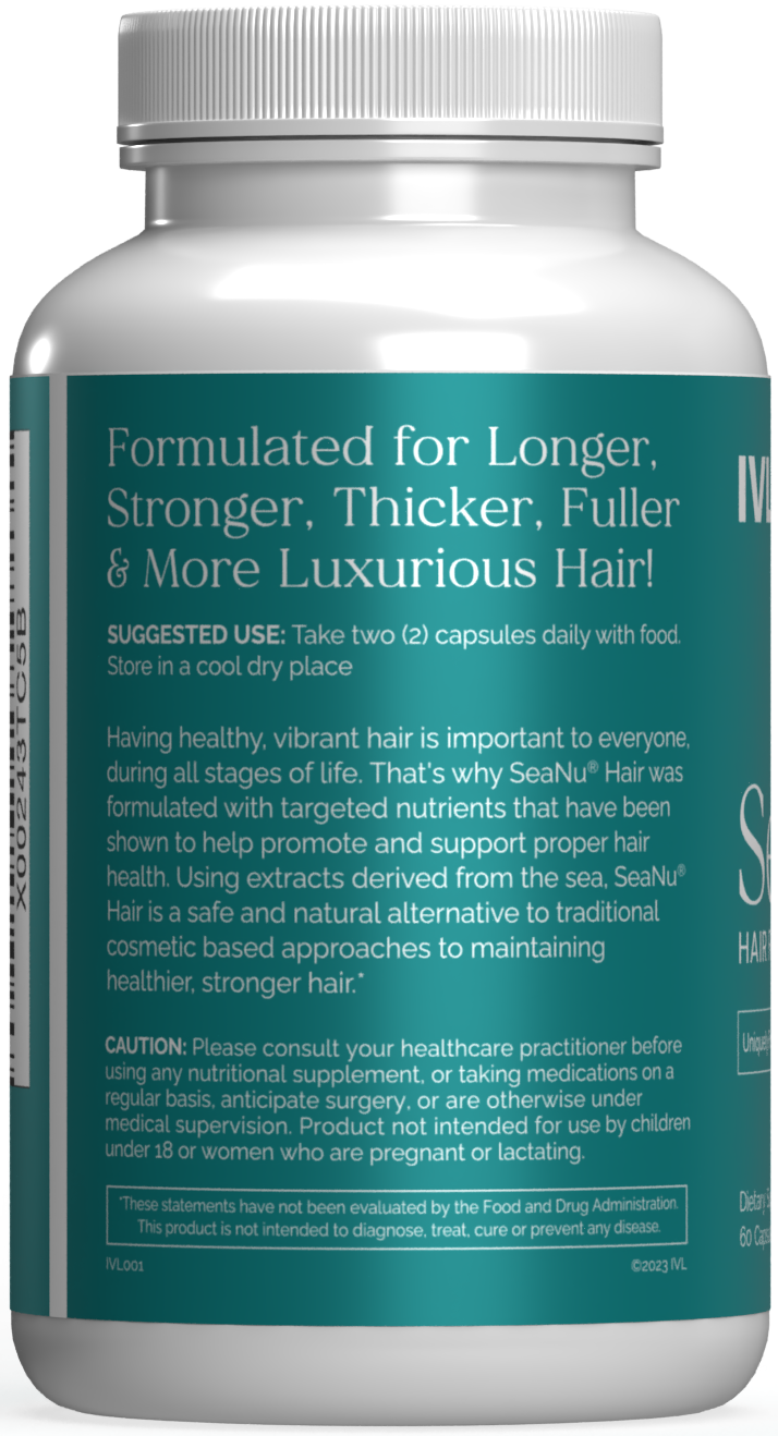 Enhance your hair care routine with SeaNu Hair. Incorporate two capsules daily into your regimen to benefit from a blend of 13 natural ingredients, including vitamins niacin and biotin, and zinc. This unique composition is designed to support the natural health of your hair and scalp with ingredients sourced from plants and the sea.