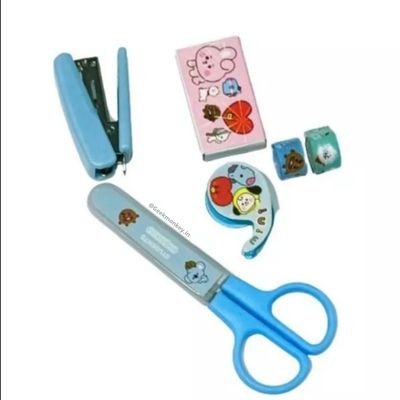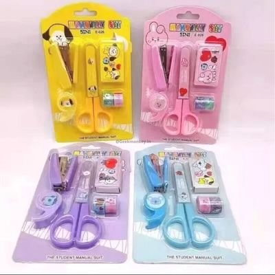 Package Contents: 1 set * All in One Stationery Set (set includes 1 x Scissors with round tip and stainless steel blades, 1 * Decorated Blade Guard, 1 x stapler, 1 x stapler pin case, 1 x tape dispenser, 2 * small washi tape)